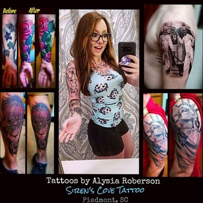 One of South Carolina's BEST tattoo artists around, female tattoo artist Alysia Roberson, and has been tattooing since 2007! Clean and friendly environment with highly experienced artists that can tattoo almost any style, and *DRAW*! Realistic tattoos, portrait tattoos, animal portrait tattoos, people portrait tattoos, custom tattoos, freehand tattoos, traditional/oldschool tattoos, lettering/script tattoos, color tattoos, black and grey tattoos, cover-up tattoos, ect.! Former owner of Siren's Cove Tattoo in Powdersville, SC For more of our work, please like and follow on Facebook and Instagram! :-D www.facebook.com/sirenscovetattoo Www.facebook.com/sirenscovetattoo www.facebook.com/Alysia.Roberson.Tattoo.Artist Instagram: @tattoos.by.ar Twitter: @AlysiaRoberson #bestofsc #tattoos #tattooartist #sctattoo #sc #sctattooartist #sctattooshop #sctattooist #sctattooer #tattoosiren #sirentattoo #mermaid #mermaidtattoo #southcarolinatattooshop #realistictattoo #portraittattoo #animaltattoo #blackandgreytattoo #colortattoo #coveruptattoo #coverup #tattoonightmares #oldschooltattoo #southcarolinatattooartist #greenvillesc #downtowngreenville #yeahthatgreenville #andersonsc #clemsonsc #Alysiarobersontattoo #sirenscovetattoo