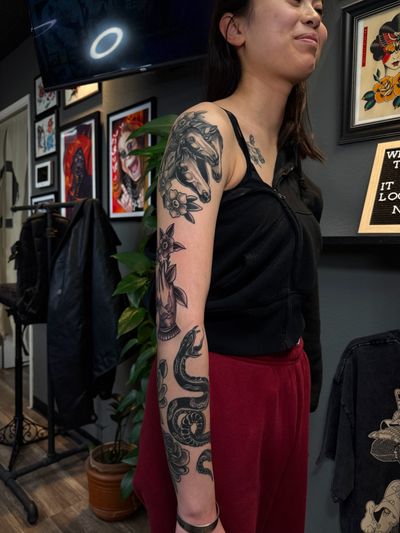 Mariana Domenes is a Brazilian tattoo artist based in San Diego, CA. A married mother of two boys, she is a Christian and passionate about life. She specializes in American Traditional tattoos, florals, ornamental mandalas, blackwork, and fine line, creating meaningful and timeless designs.