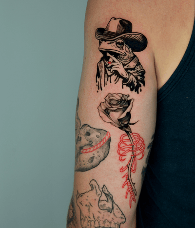 Milk is the man! He’s designed my whole sleeve, and it’s been seamless. He always has great ideas and the execution is top-notch. He did a really good job of making sure to weave in the themes and the red color and I wanted, and I couldn’t be happier. He’s covered a bunch of styles on me, and they’ve all look great, the realism, especially stood out as a fan favorite of people who comment on my tattoos.