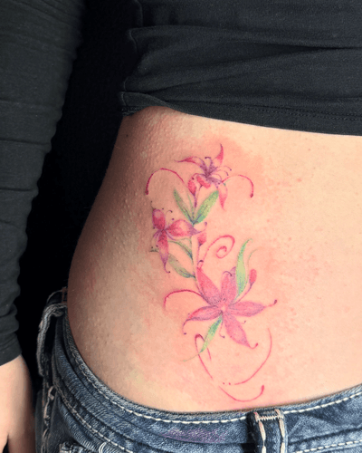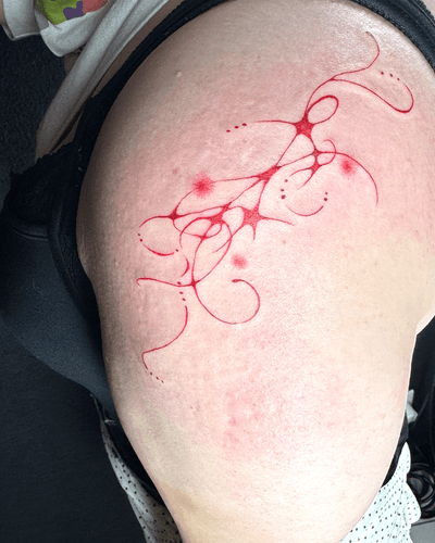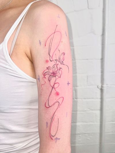 Abstract fine line & colour tattoos in London. Flowing, ornamental designs that follow your body’s rhythm. Custom only, gentle session.