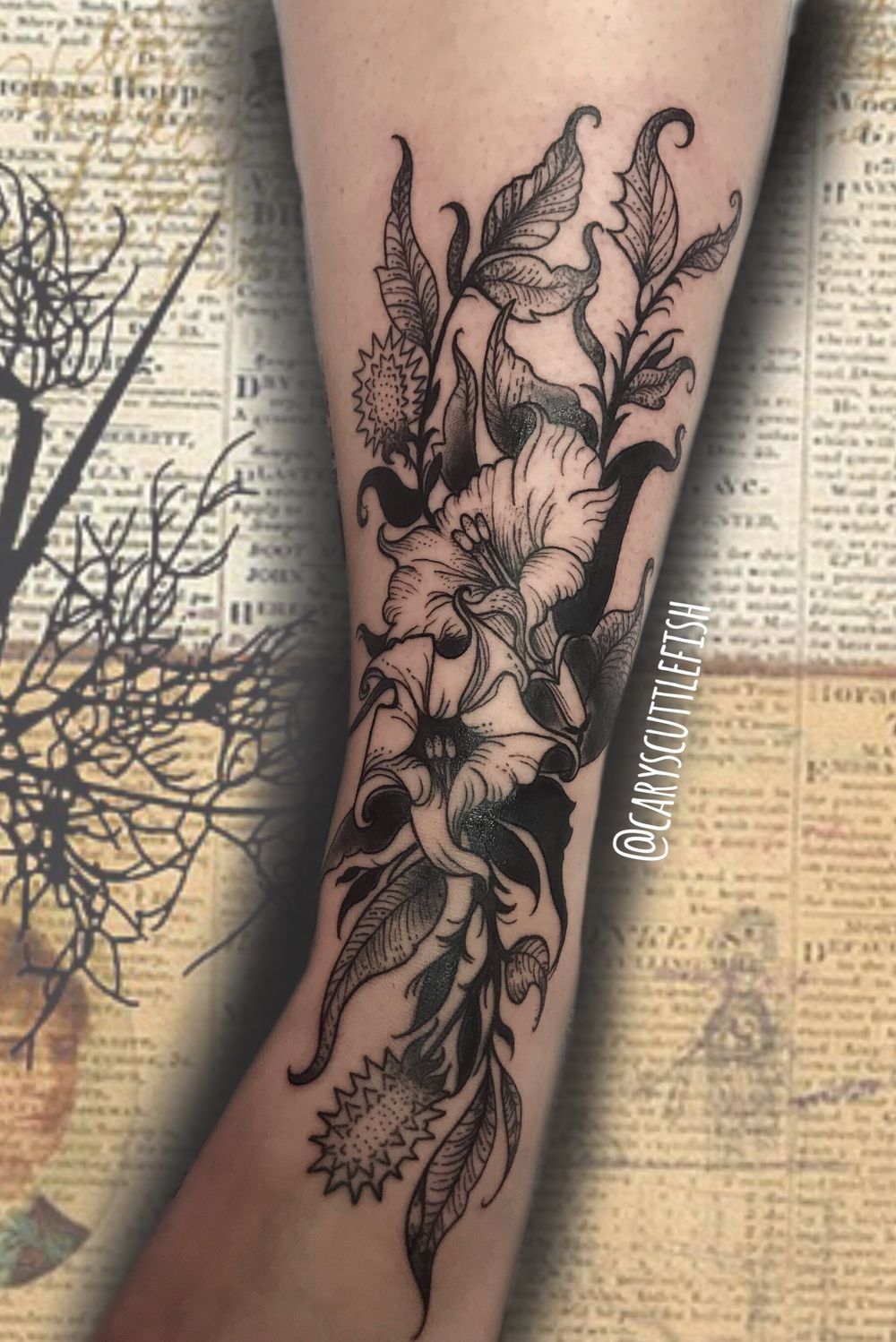 Black and grey datura piece. Email caryscuttlefish@hotmail.com to book. #edmontontattoo #edmonton #blackwork #datura #flower #blackandgreyflowers