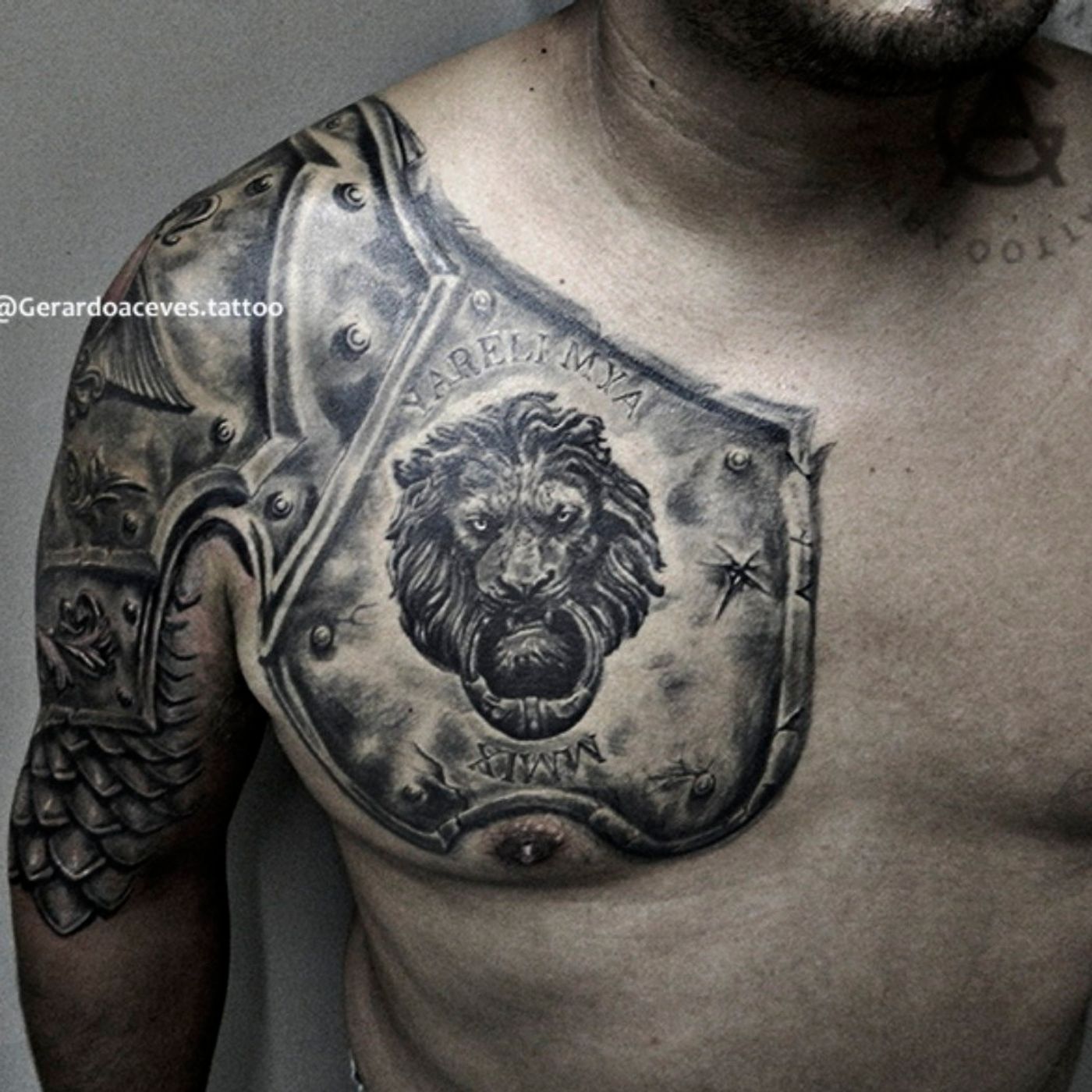 Lion armor tattoo . . . . . . #sculpture #armortattoo #armor #liontattoo #lion #blackandgreytattoo #blackandgrey #realistictattoos #chest #chesttattoo #tattoo #tattooartist #tattooart