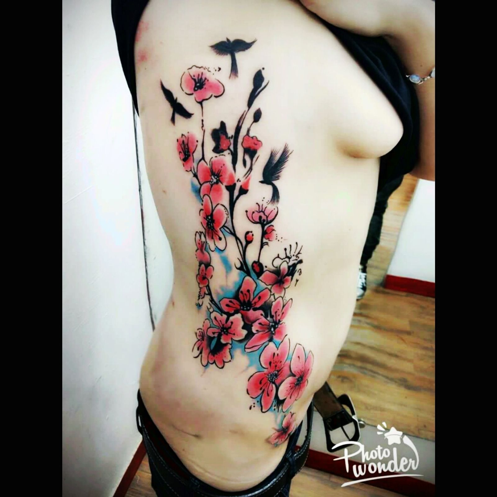 Beautiful Cherry blossom tattoo #birds #colorfull #girlwithbellypierced #art #artwork #tattoopiece #tattoos #onesitting #thanks #appreciating #rockband #muse #UNFRIEND in case offended ....with Jojo Mmt he is the best 😉