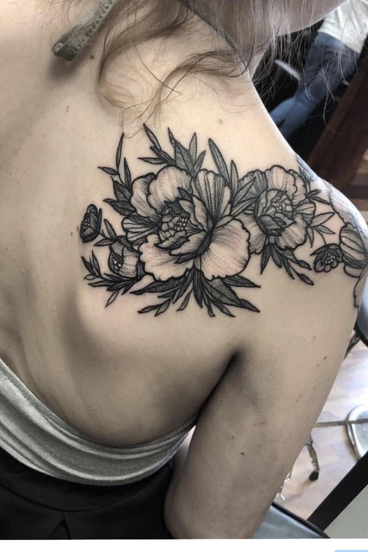 #shoulderpiece #floral #blackwork #blackworktattoo #flowertattoo #florals #floraltattoo #blackworktattoos #blackworkflowers #prettytattoos #stipple #dotwork #dotworktattoo