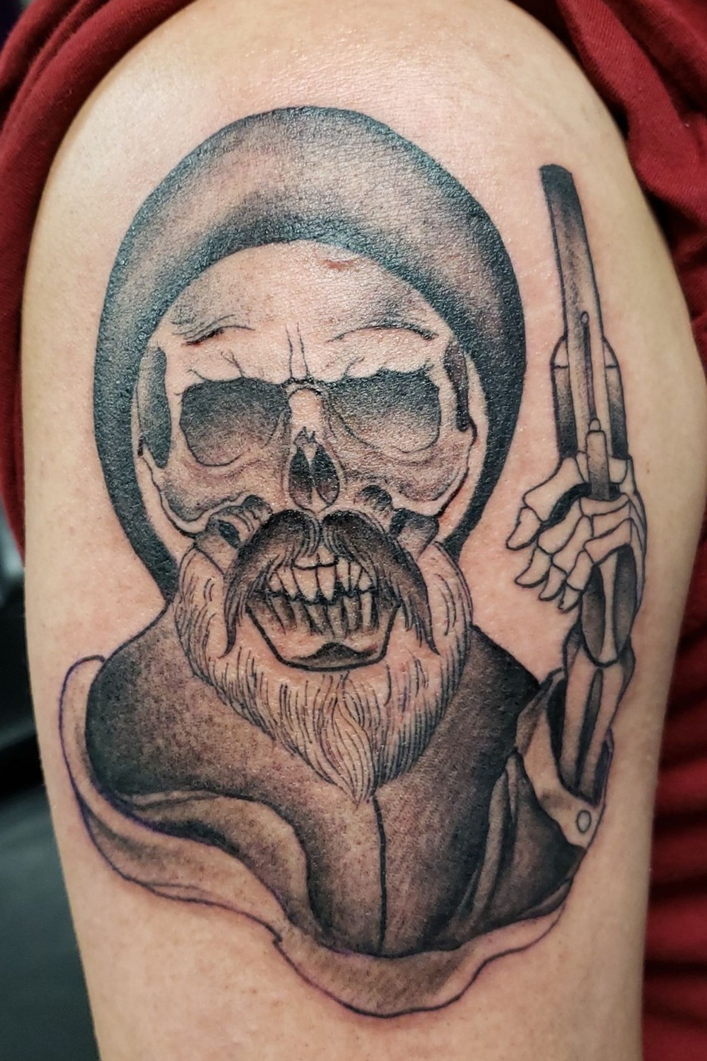 The original art work for this was done with ballpoint pen on a handkerchief his buddy from prison sent him. I cleaned it up and did my version. I love it when my clients give me some freedom to customize theyre tattoos in my own way. #blackandgreytattoo #coloradotattooartist #denvertattooartist. #milehigh