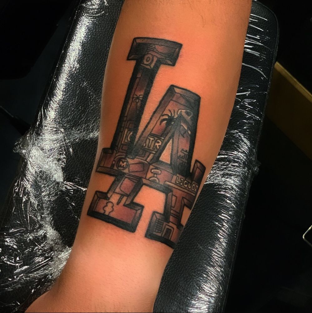 Today got to do this LA Tattoo for @jerreazy___ with a bunch of stuff representing LA 🔫💥 Done at the shop @crackerjacktattoos ⚡️ Thanks brother for the trust 🤟🏻 I'll see you soon! •