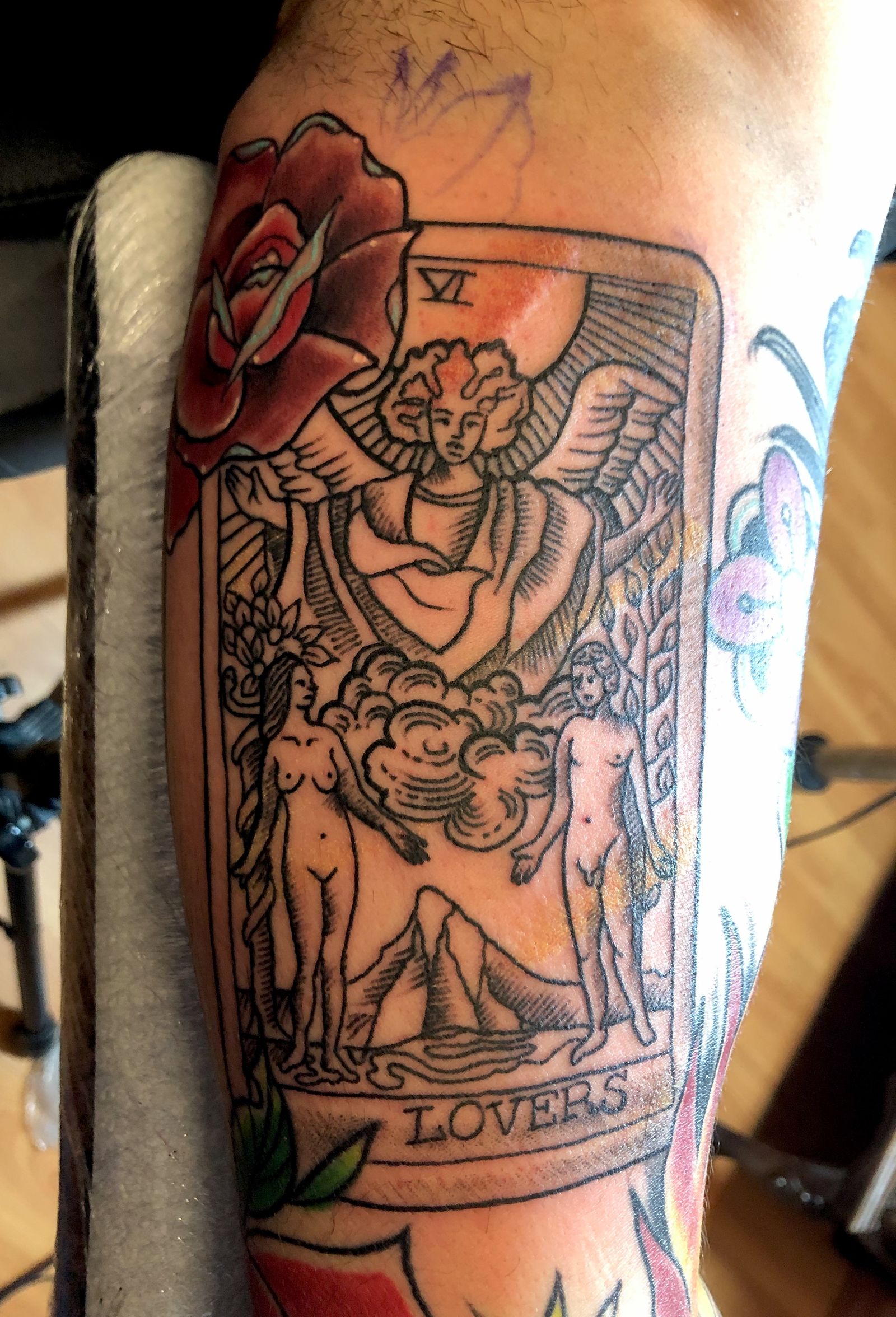 tattoo Tarot card Significato: La carta degli amanti indica scelte, romanticismo ed unione. Si è arrivati ad una svolta decisiva, ad un bivio e la scelta che si farà potrebbe avere conseguenze sulla famiglia, sulla carriera e sui rapporti sentimentali. Bisogna pensare attentamente prima di decidere, poiché il futuro è nelle proprie mani.