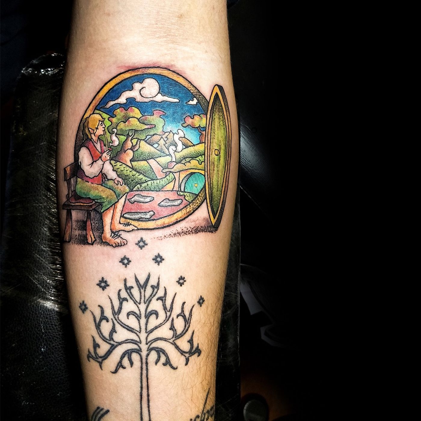 Bilbo enjoying the Hobbiton view with a pipe.