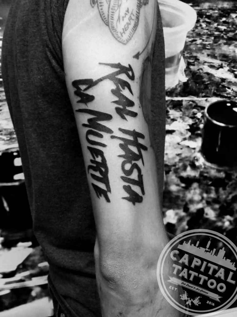 Tatuaje #realhastalamuerte por Rob Hernandez👊🏾 diseño propuesto por el cliente 🤟😎 . . . . . #robhernandeztattoo #nero #fuckingvida #letra #texto #malvadolettering #estilomalvado #lettering #letters #letteringtattoo #darklettering #freehand #inked #handmade #handletras #letras #caligraphy #calligrafia #script #tattoo #customletters #tattoolifestyle #radiant #capitaltattoo #tattoosatelite #guadalajara #tattooguadalajara #cdmx #tattoomexico #capitaltattoomexico