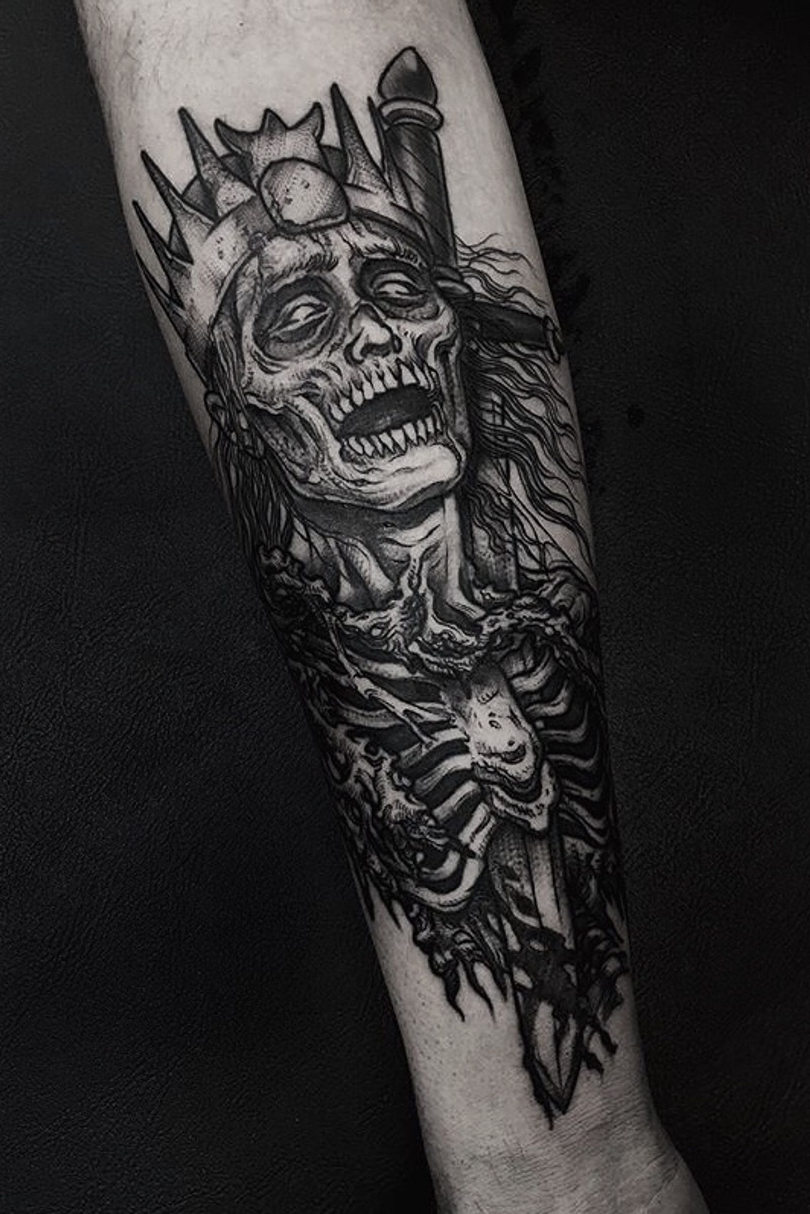 Dead king vol.2 #blackwork #gore #dead #skull # skulltattoo #medieval #blackworkers #crown #king #dagger #sword #horror