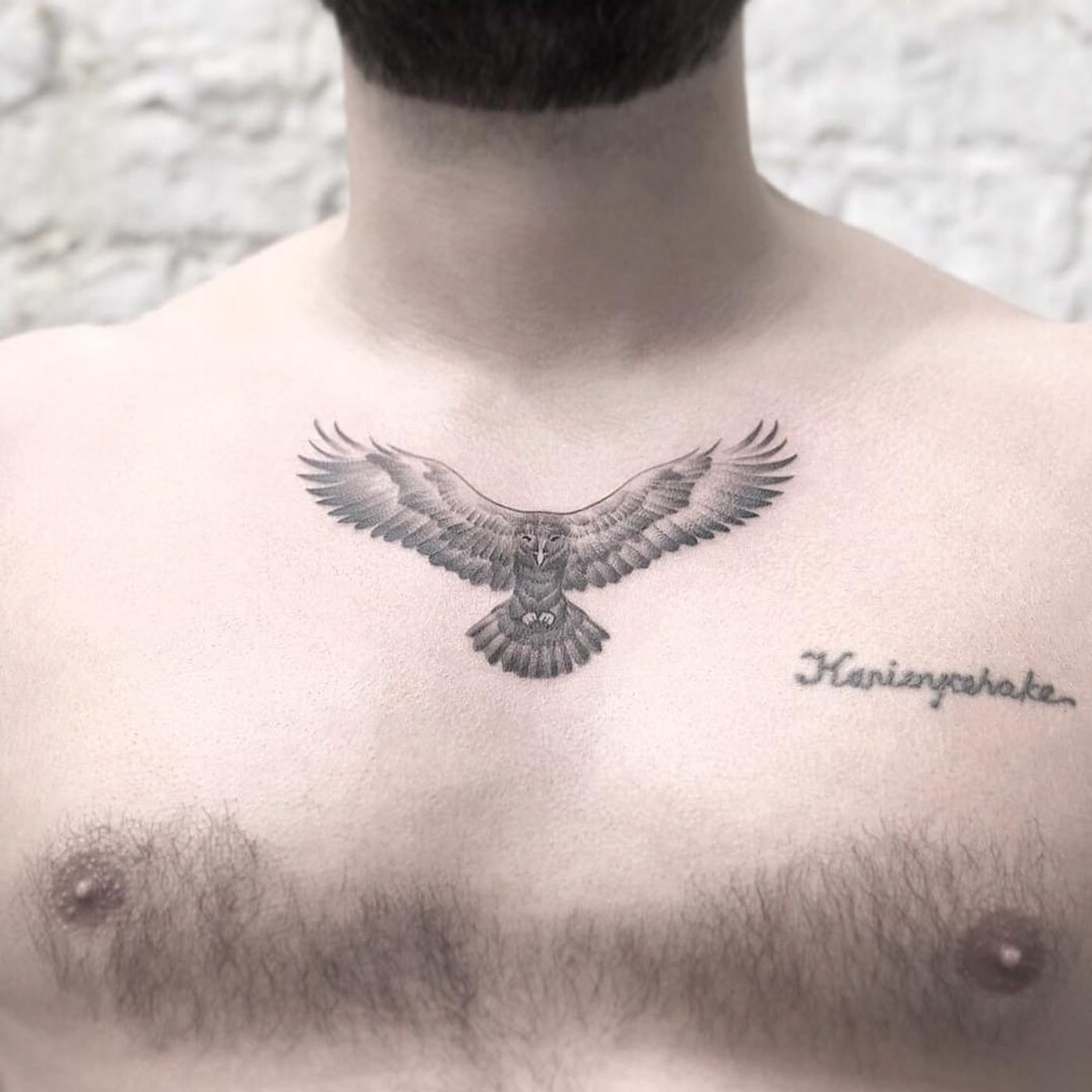 Black and grey bird tattoo by Jonathan Mckenzie #JonathanMckenzie #tattoodo #tattoodoapp #tattoodoappartists #besttattoos #awesometattoos #tattoosforwomen #tattoosformen #cooltattoos #tattooideas #eagle #chest #bird
