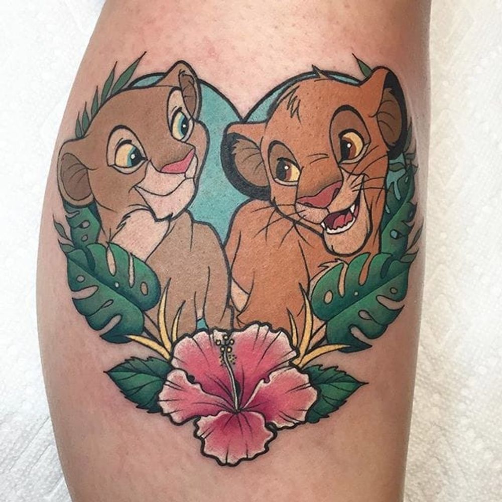 Lion King tattoo by Jaclyn Huertas. #JaclynHuertas #lionking #disney #film #movie #animated #lion #animal #simba #nala #couple