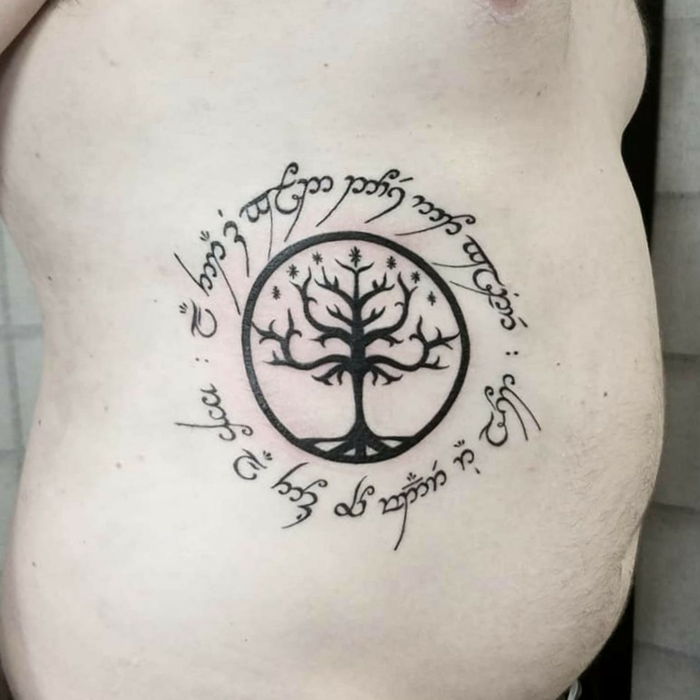 The tree of Gondor and Elvish script. #lotrtattoo #blackworktattoo #lineworktattoo #elvish #nerdtattoo #cooltattoos