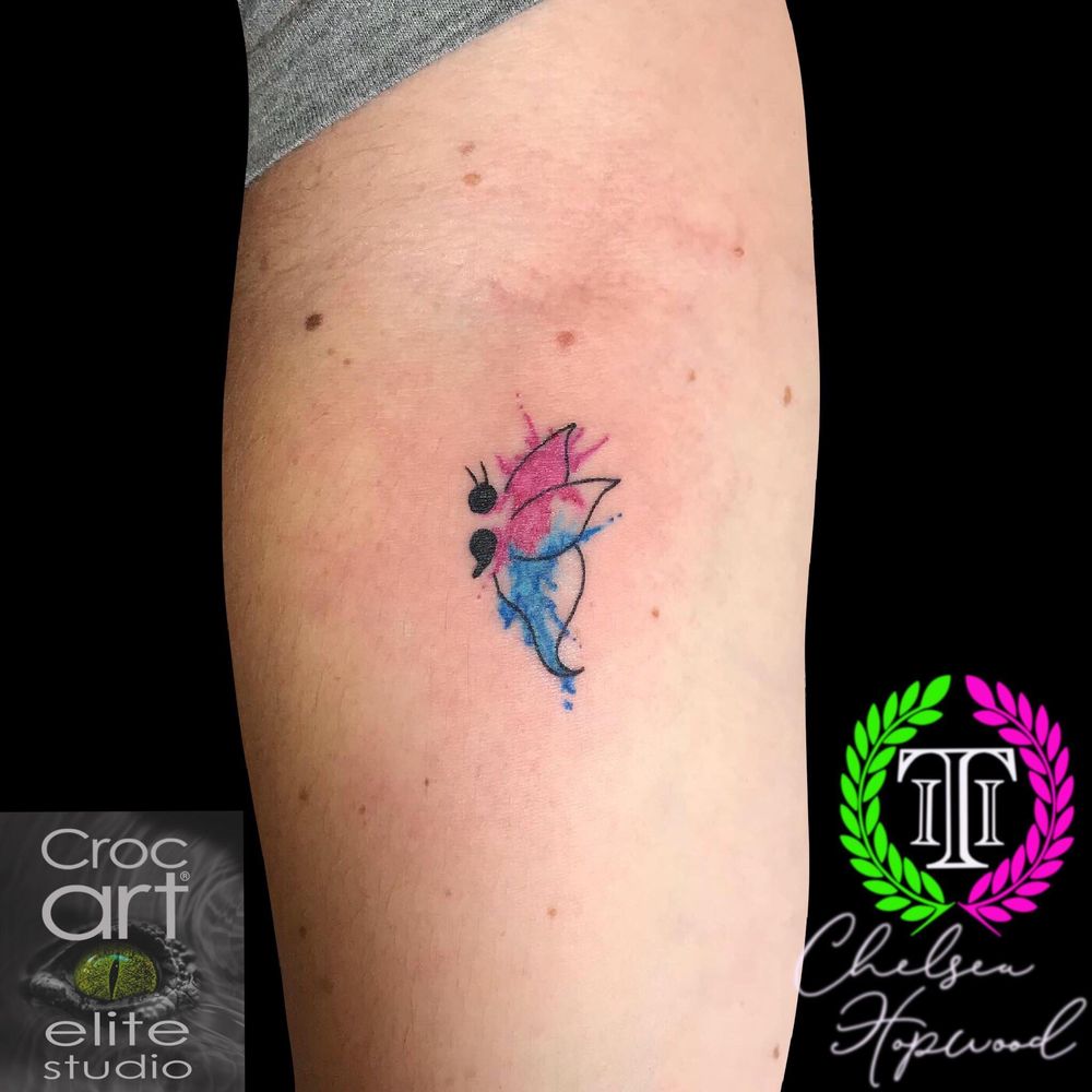 Semicolon butterfly w/ a little watercolour splash! #semicolon #mentalhealth #mentalhealthawareness #sapuk #suicideawareness #watercolour #butterfly #smalltattoos #cutetattoos
