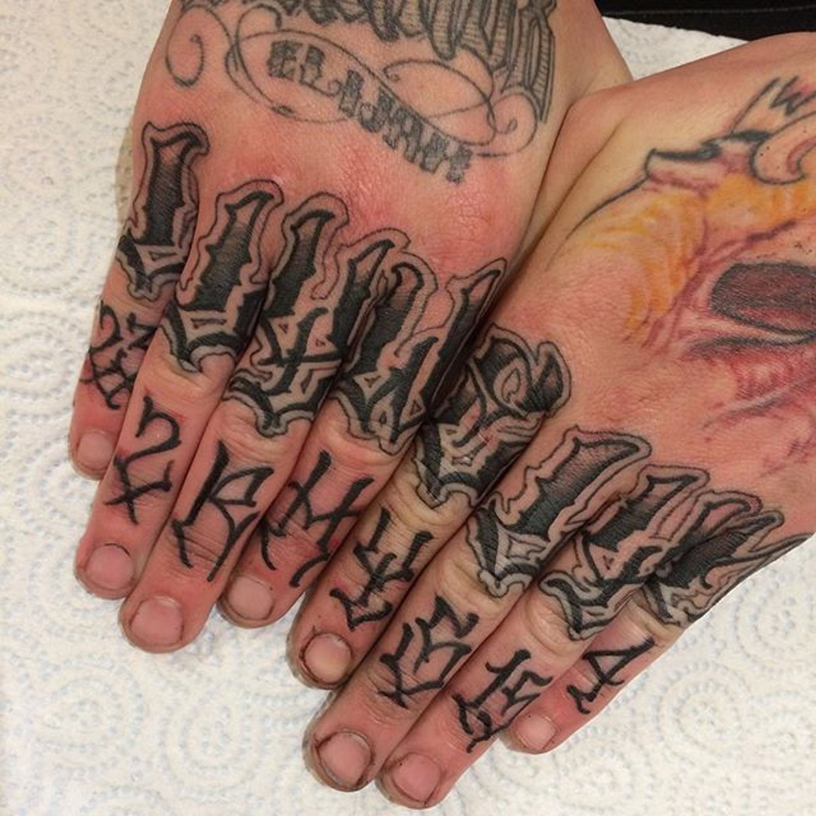 'Llywelyn Rhys' Lettering Tattoo by Niorkz Meniconi #Lettering #KnuckleTattoos #LetteringKnuckleTattoos #ScriptTattoos #Script #FingerTattoos #NiorkzMeniconi