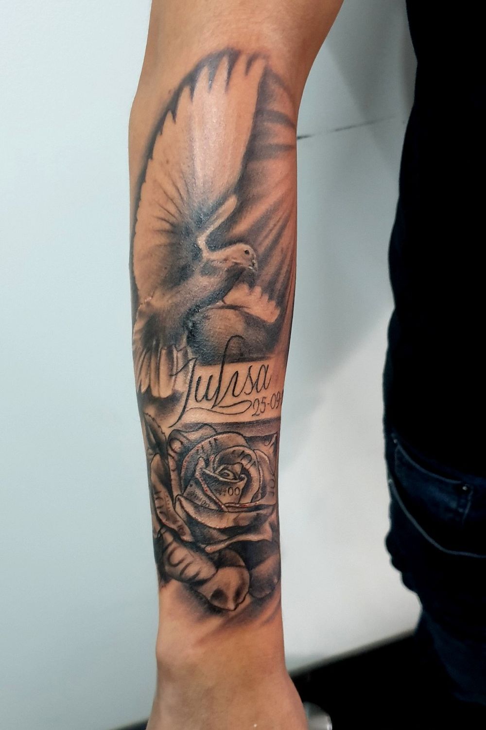 Memorial tattoo #dove #euromoneyrose #blackandwhitetattoo #tat2holics #denhaag #LowerArm
