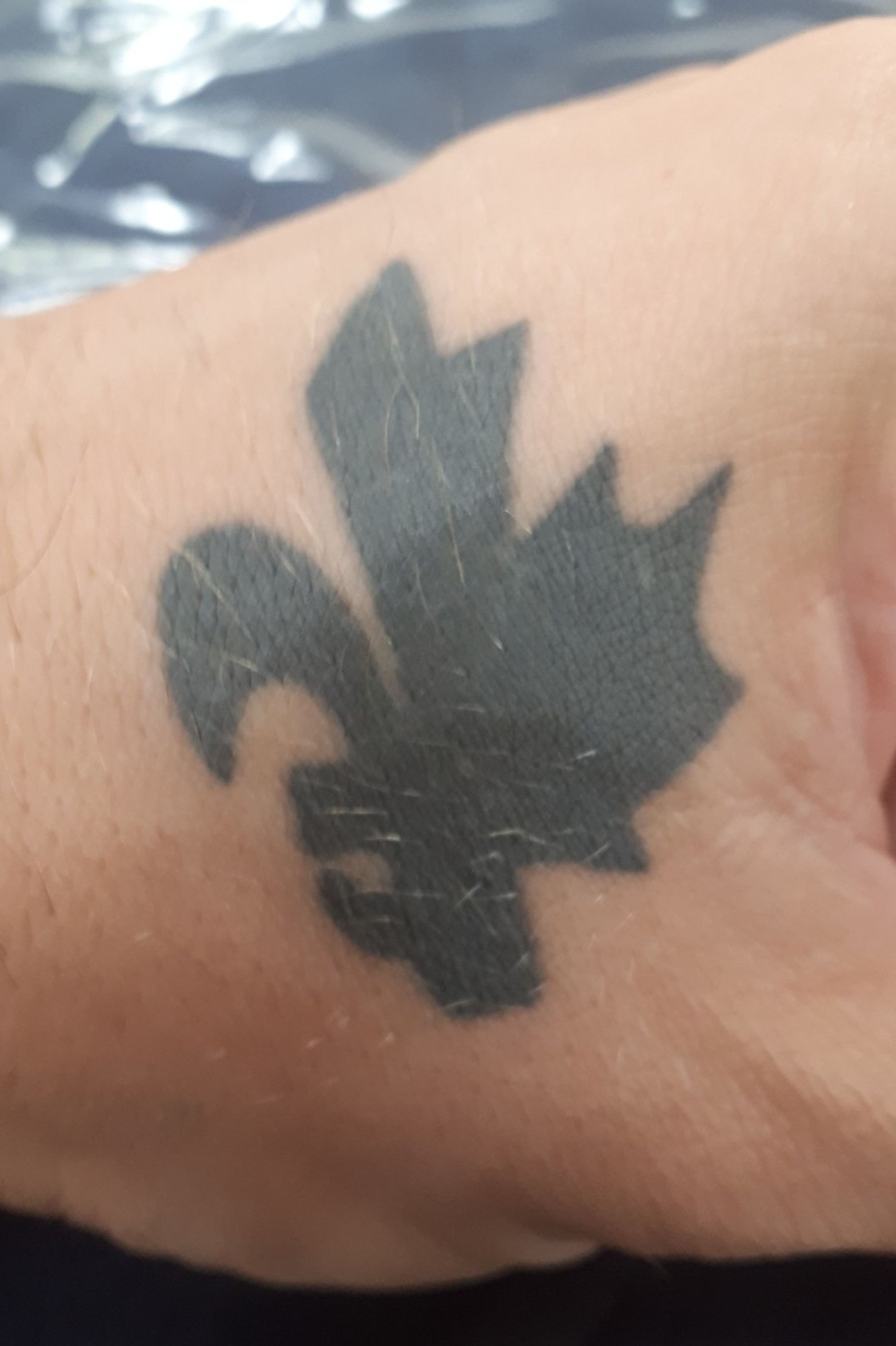 Franco Canadian, maple leaf mix with Fleur de lys. Hand tattoo. Shop: Zombie, Borden, Ontario - Canada.