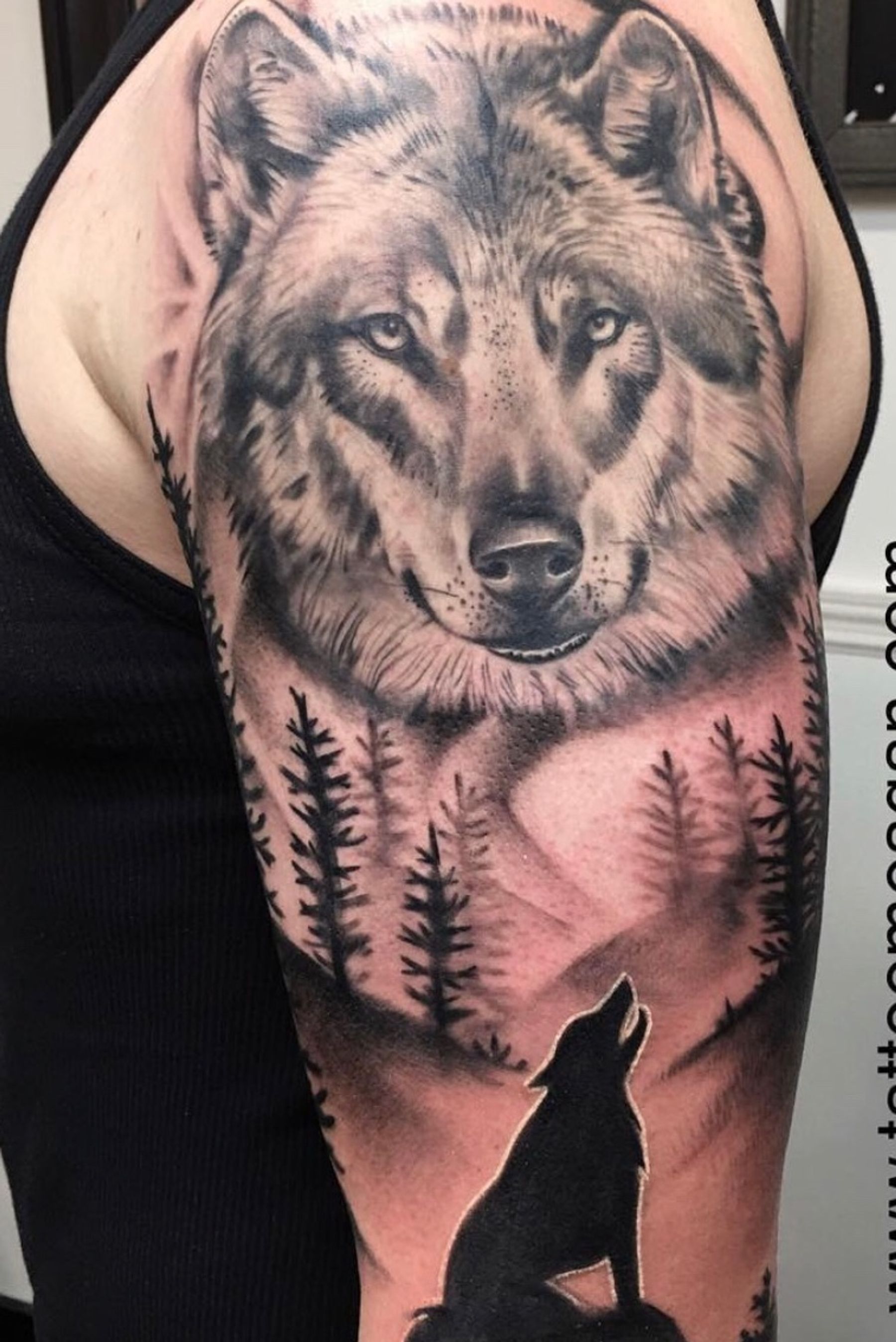 Black and grey wolf tattoo