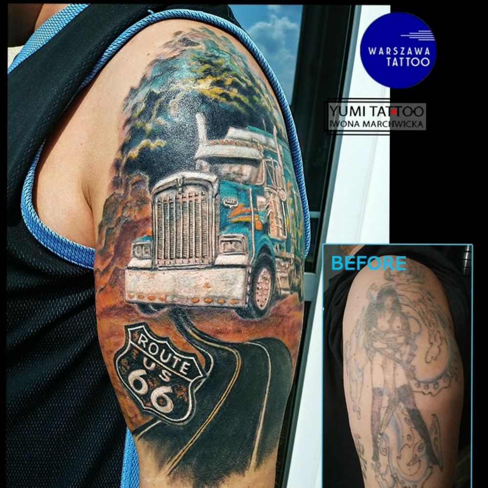 American truck and Route 66 - cover of an old tattoo #americantruck #american #truck #route66 #route66tattoo #coverup #coveruptattoo #colortattoo #trucktattoo #warszawatattoo #warsawtattoo #tattoowarsaw #Yumi #yumitattoo #yumi_iwona #tir #ciężarówka