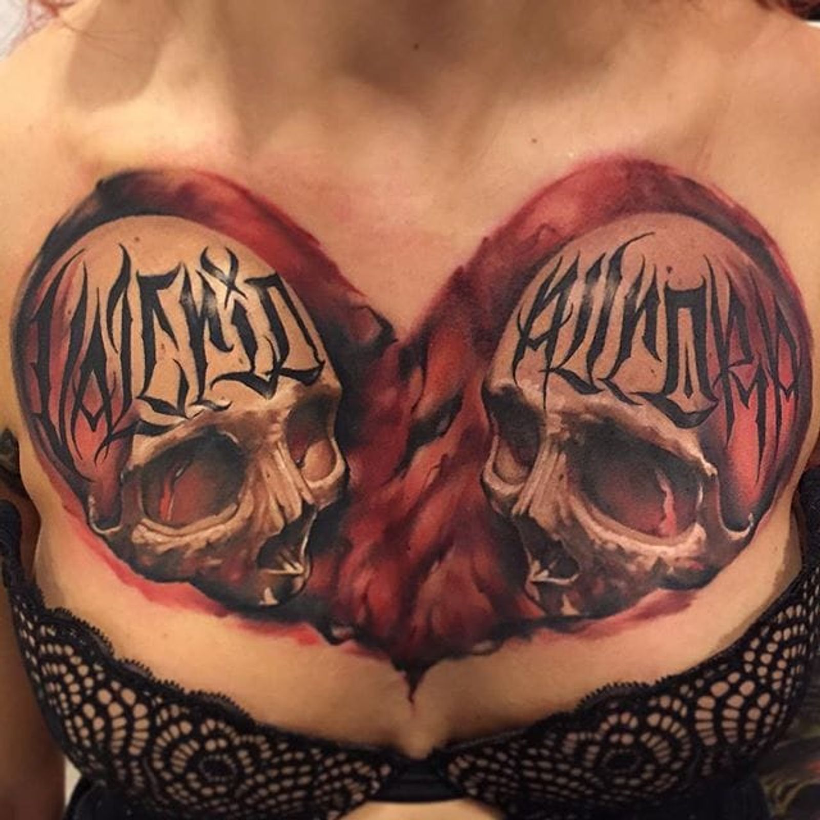Double skull chest tattoo. By Benjamin Laukis. #realism #skull #BenjaminLaukis #colorrealism