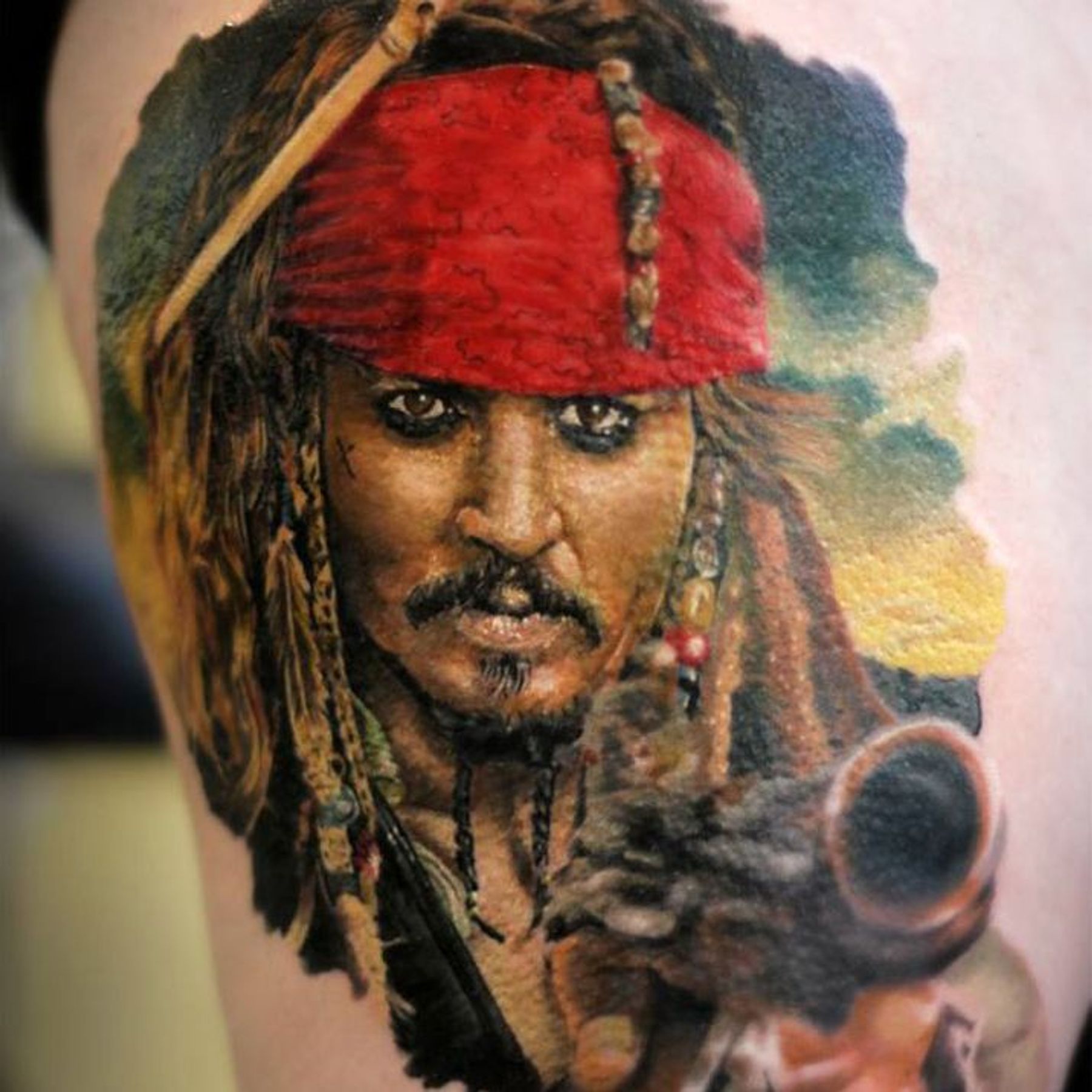 Johnny Depp as one of his most famous characters Captain Jack Sparrow. So many cool Captain Sparrow Johnny Depp tattoos out there! Johnny Depp Tattoo by Taguet Michael. #johnnydepp #johnnydepptattoo #PiratesoftheCaribbean #PiratesoftheCarribeanTattoo