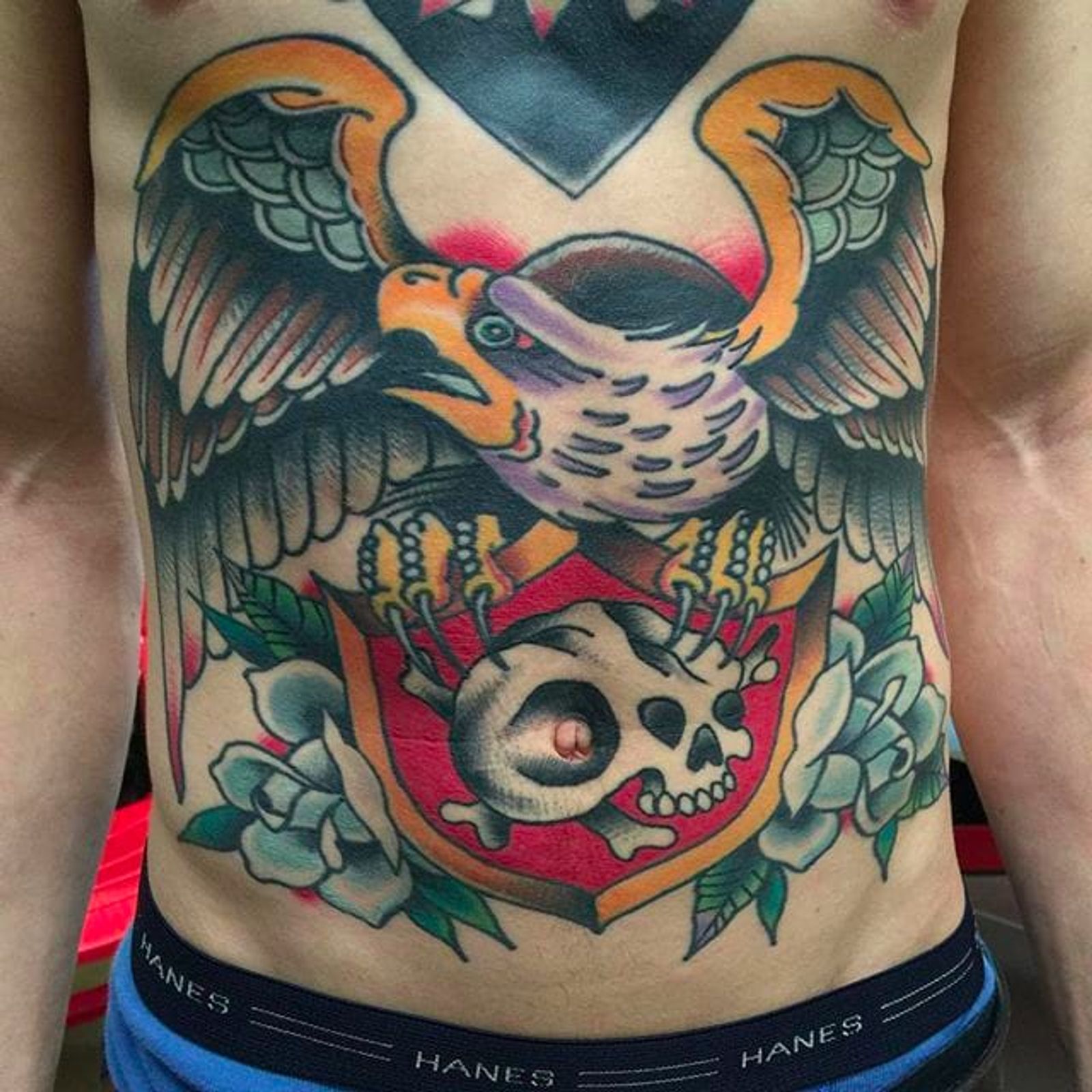 Solid eagle tattoo in stomach by Billy White. Photo: @billywhitetattoos #eagle #traditional #fronttattoo #stomachtattoo