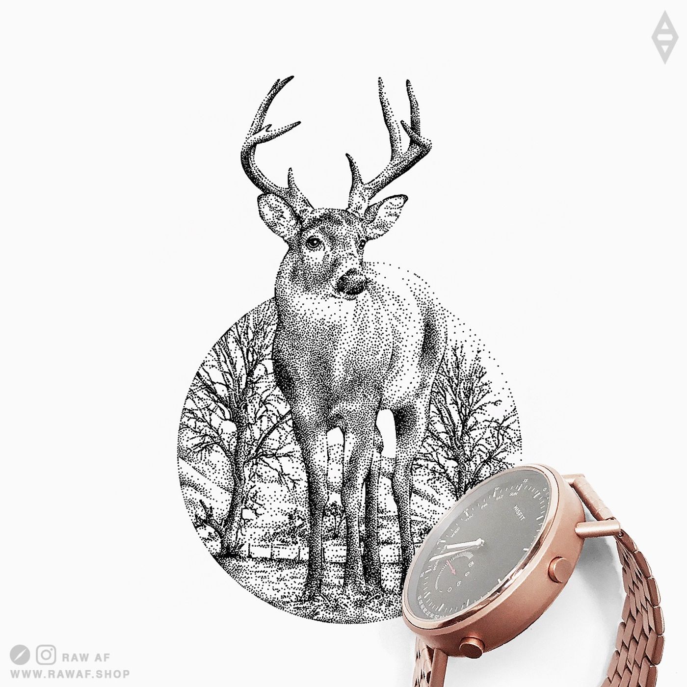 Deer with trees in the background. More on my Instagram (the_rawflow) or web: www.rawaf.shop #dotwork #blackwork #deer #animal #nature #black #blackandgrey #geometric