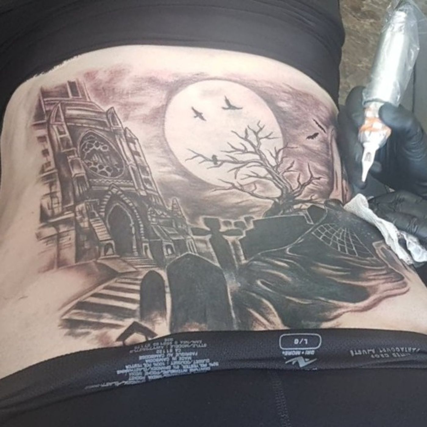 My lower back piece tattoo, being done, (which is a cover-up, btw).