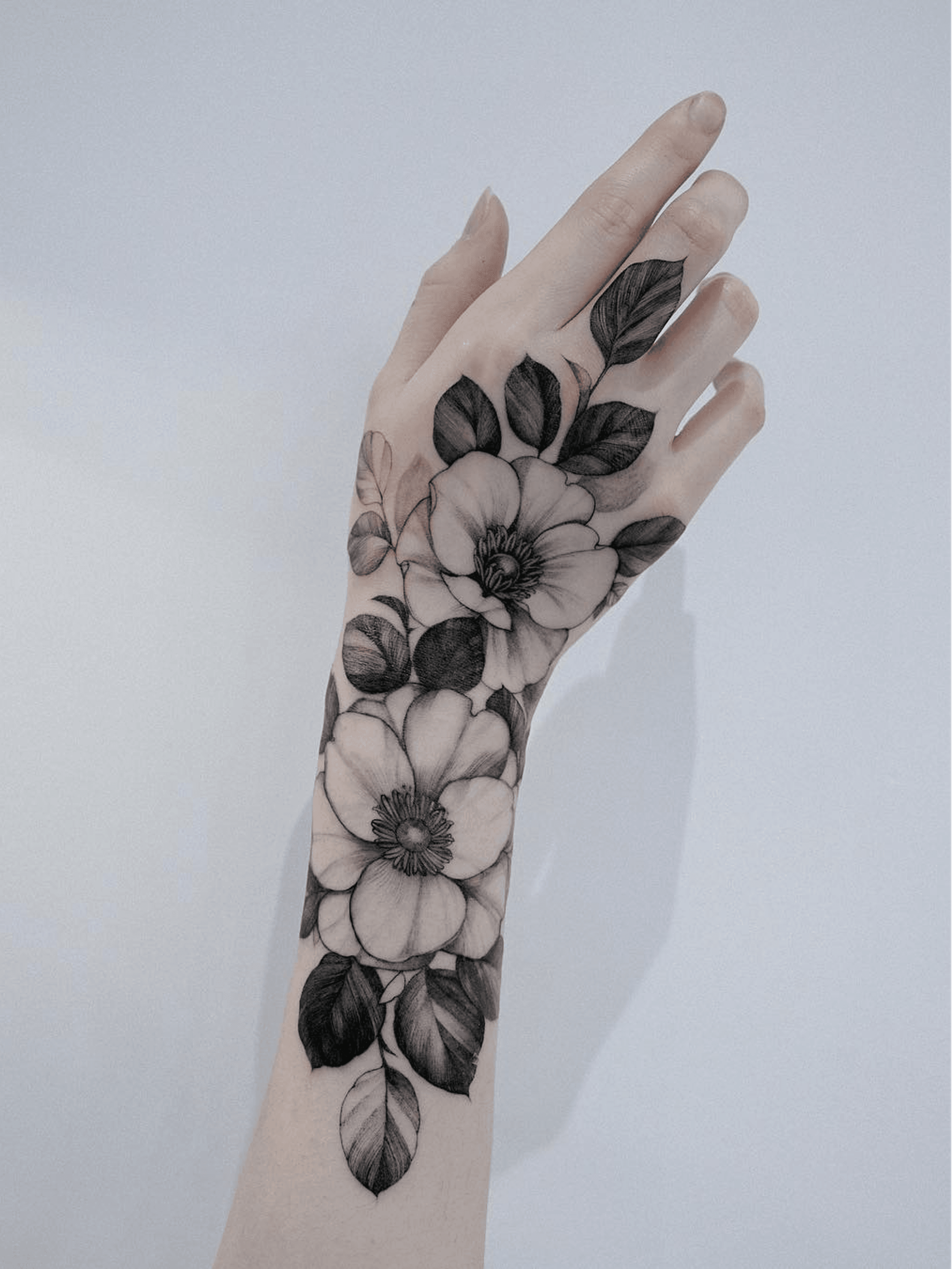 Hand tattoo by Zihwa #Zihwa #tattooartist #tattoodo #tattoodoapp #awesometattoo #besttattoo #handtattoo #hand #flower #floral #nature #illustrative #leaves #plant