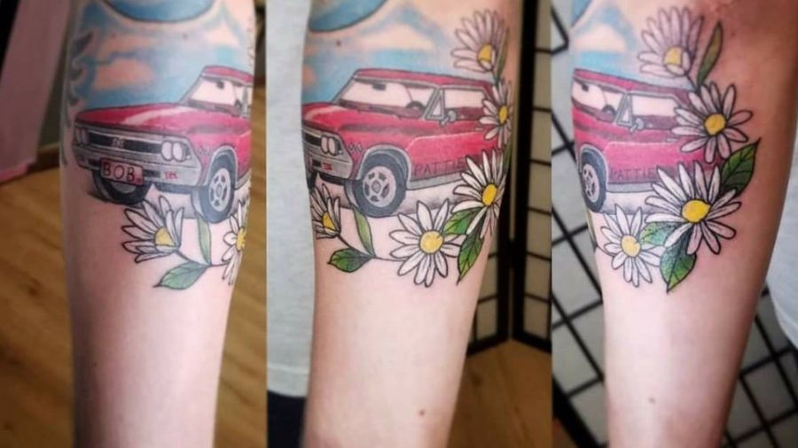 This is a tattoo dedicated to my grandparents, my grandpas last muscle car was a 1963 cherry red chevelle, his name was Bob and my grandmas favorite flower was a daisy, her name was Pattie
