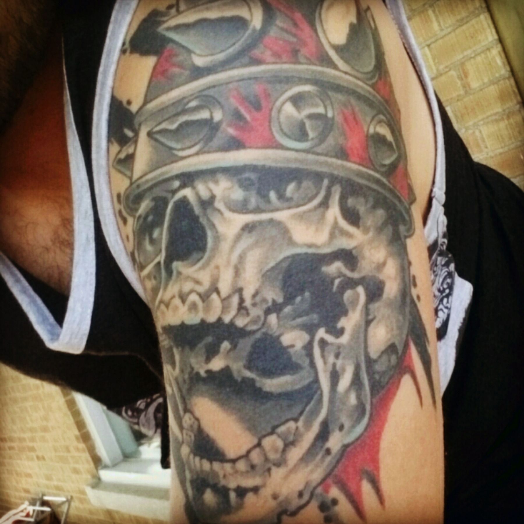 Battleaxe Warriors inspired skull and battle helmet. Done by Joel at Ink Fix in Sudbury Ontario Canada