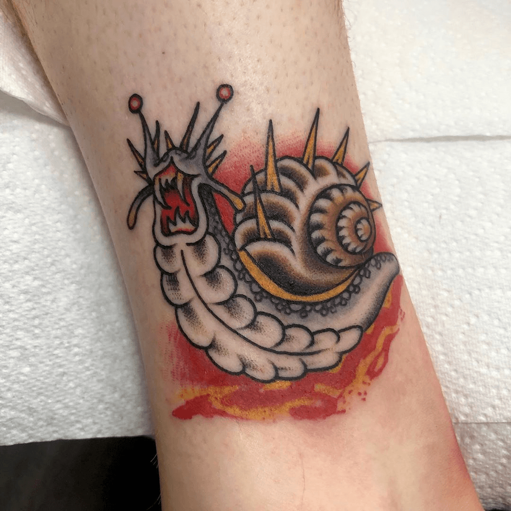 Snail tattoo by Liam Harbison #LiamHarbison #snailtattoo #snailtattoos #snail #nature #animal #monster #spikes #color
