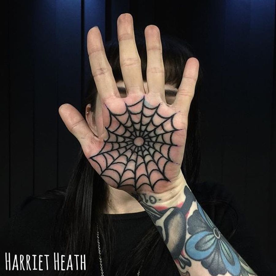 Spider Web Tattoo by Harriet Heath #spiderweb #hand #palm #HarrietHeath