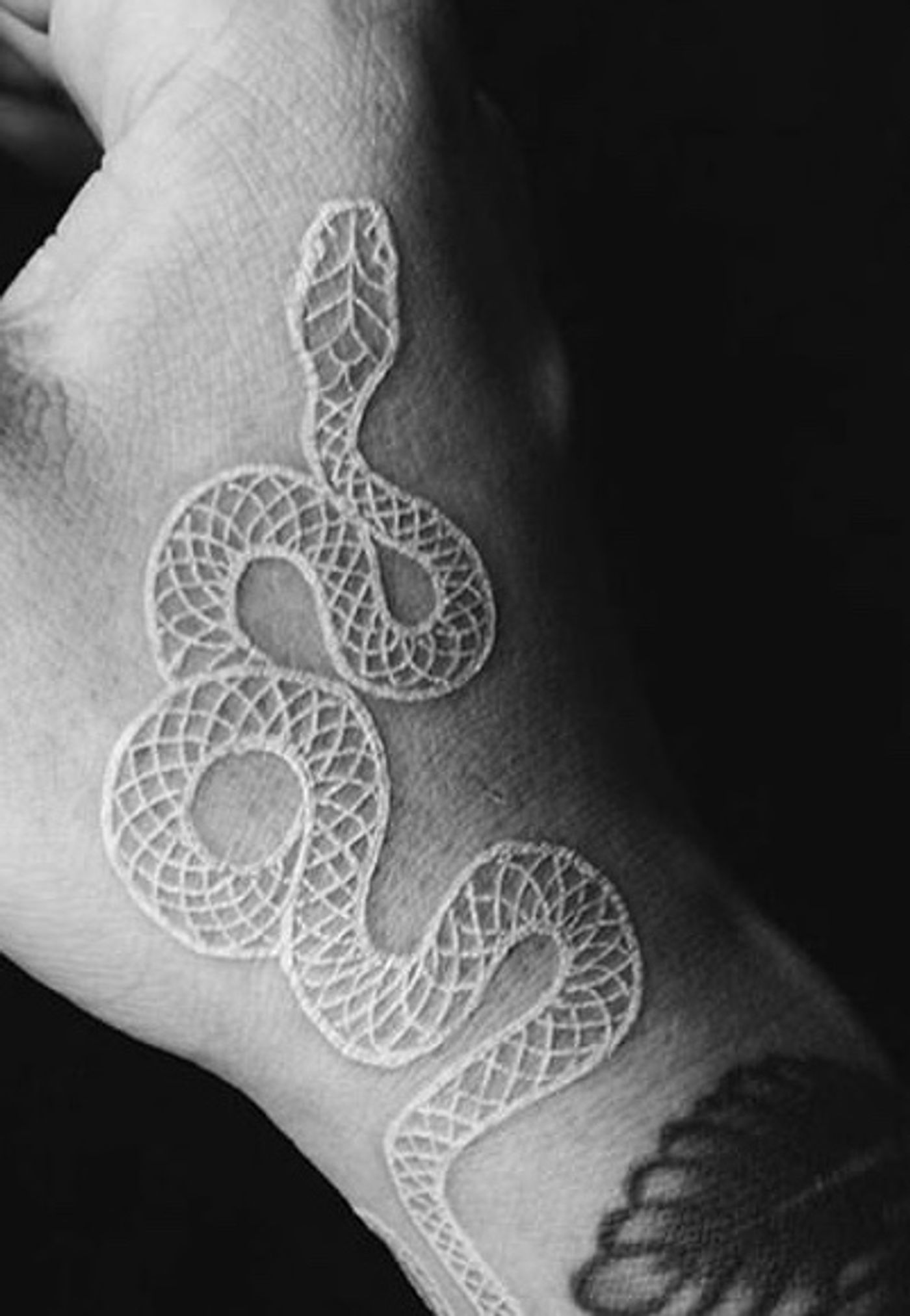 White uv reactive snake tattoo on hand. Outline of a snake in white ink that glows bright blue in black light. The white uv ink will quickly fade so you can’t see the tattoo without a black light anymore after a the first month of healing.