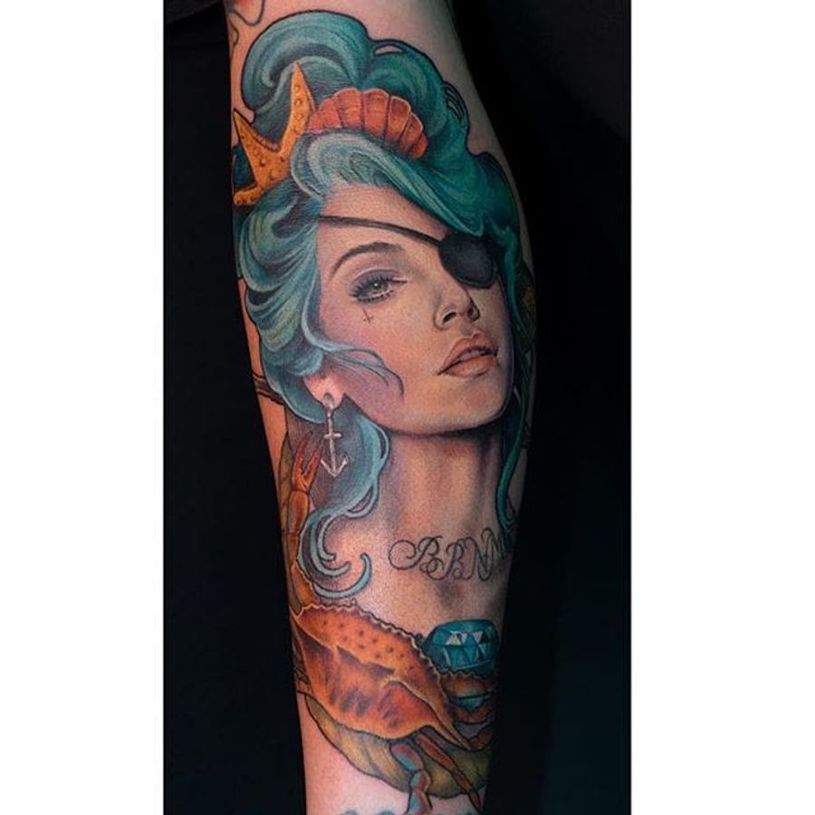 Pretty pirate lady tattoo by Maija Arminen. #realism #colorrealism #MaijaArminen #pirate #crab