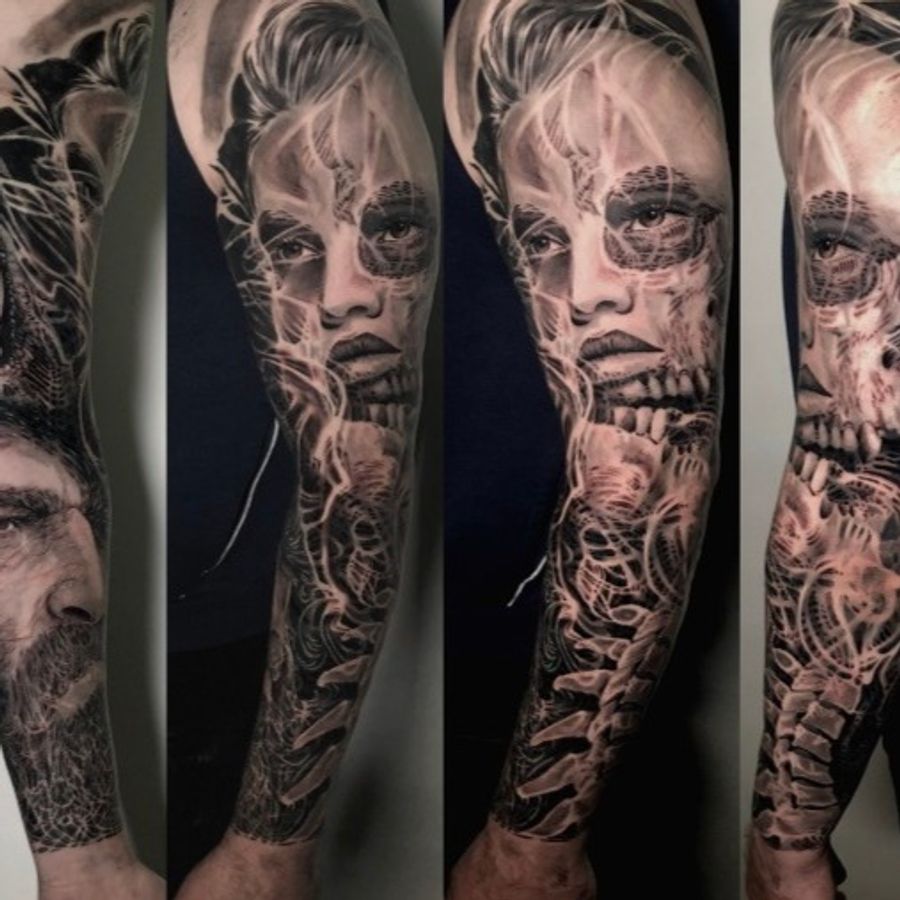 Warrior, Lady & Skull Surrounded by a smoke effect full sleeve tattoo in black and grey realism, London, UK | #blackandgrey #realistic #tattoos