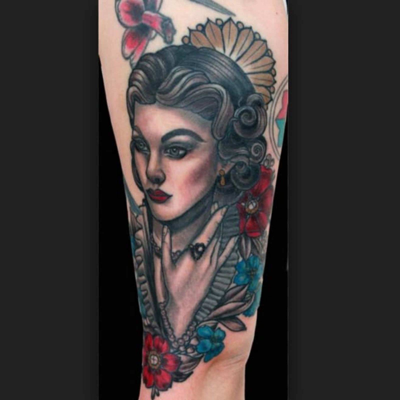 Neo-traditional style Scarlett O Hara portrait tattoo by Katelyn Crane #Neotraditional #ScarlettOHara #portrait #KatelynCrance