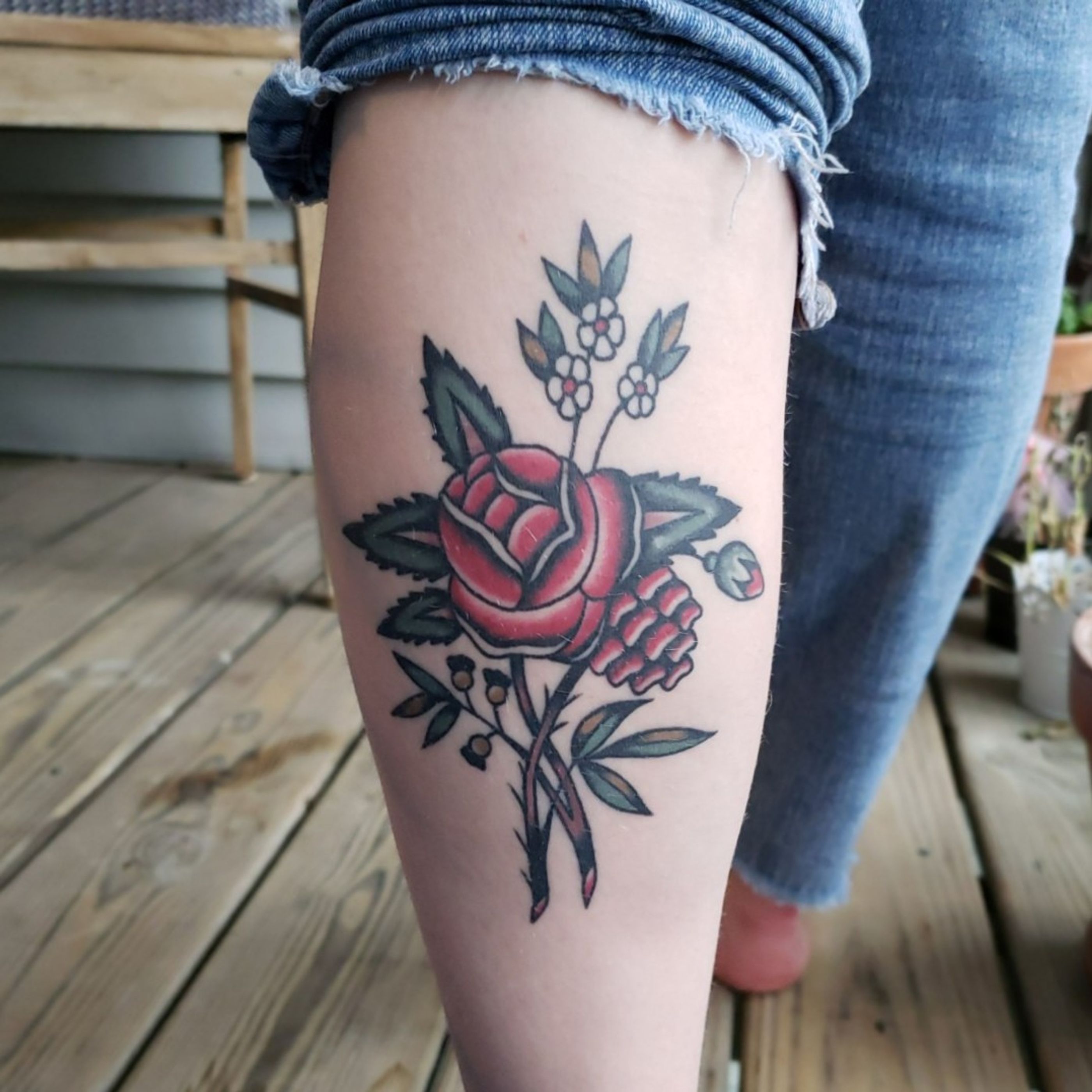 Traditional rose/flower piece on left calf. #rose #floral #flowers #bouquet #traditional #rosebud #redink #calftattoo