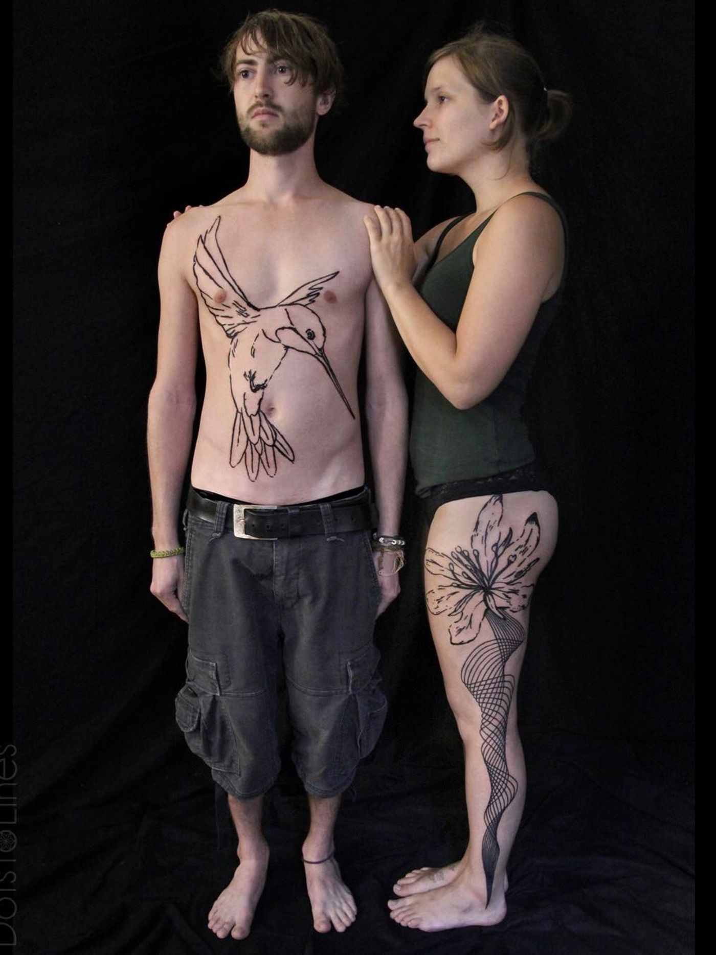 Couple tattoos by Chaim Machlev aka Dots to Lines #ChaimMachlev #DotstoLines #coupletattoos #matchingcoupletattoo #relationshiptattoo #matchingtattoosforcouples #abstract #illustrative #hummingbird #flower #linework