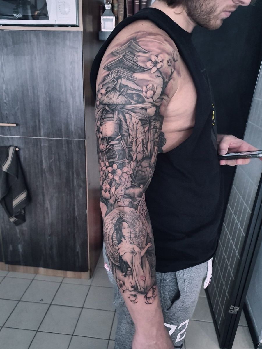 #sleevetattoo #sleeve #japanese #samurai #ronin #warrior #cherryblossom #dragon #Geisha #blackandgrey #masterpiece #realism #realistic #japanesedragon #femaletattooartist #geekstergang #brussels #bruxelles #blondyttoo #japanesegarden #japaneseart #belgium