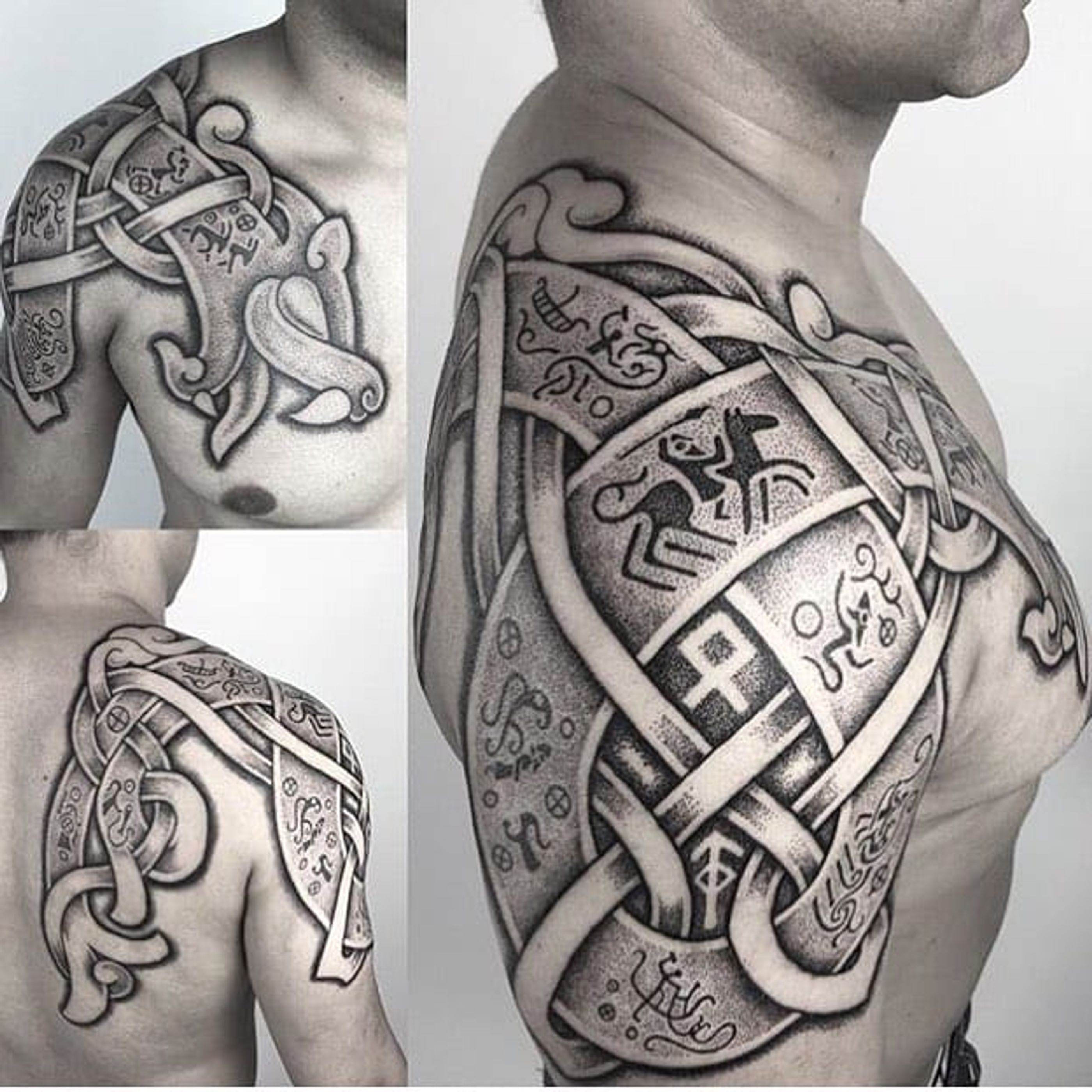 Epic shoulder tattoo by Sean Parry #SeanParry #nordic #viking #handpoked #handpoke #dotwork