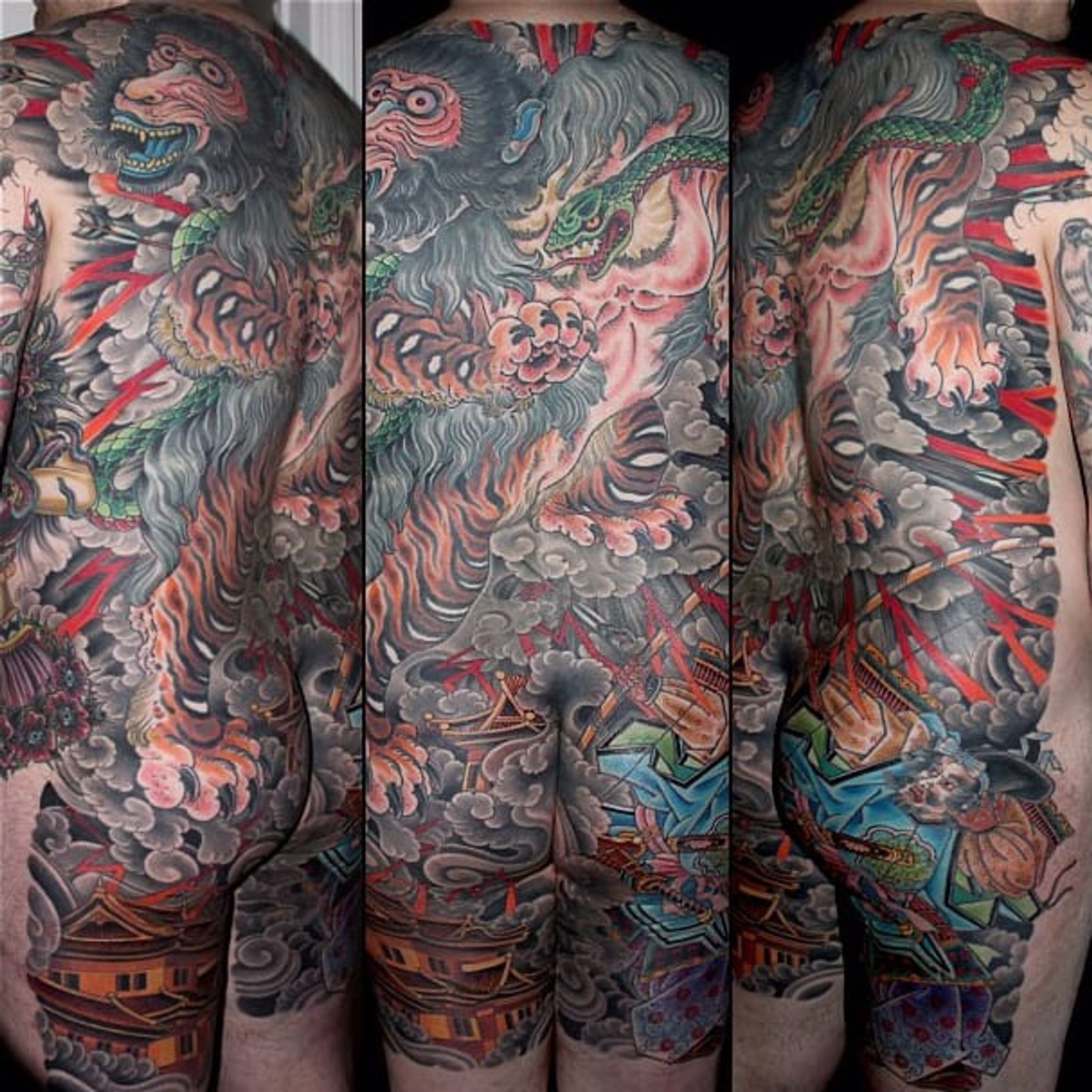 One of the best back-pieces by Rubendall. The beast depicted is a Nue. #backpiece #color #detail #MikeRubendall #Nue