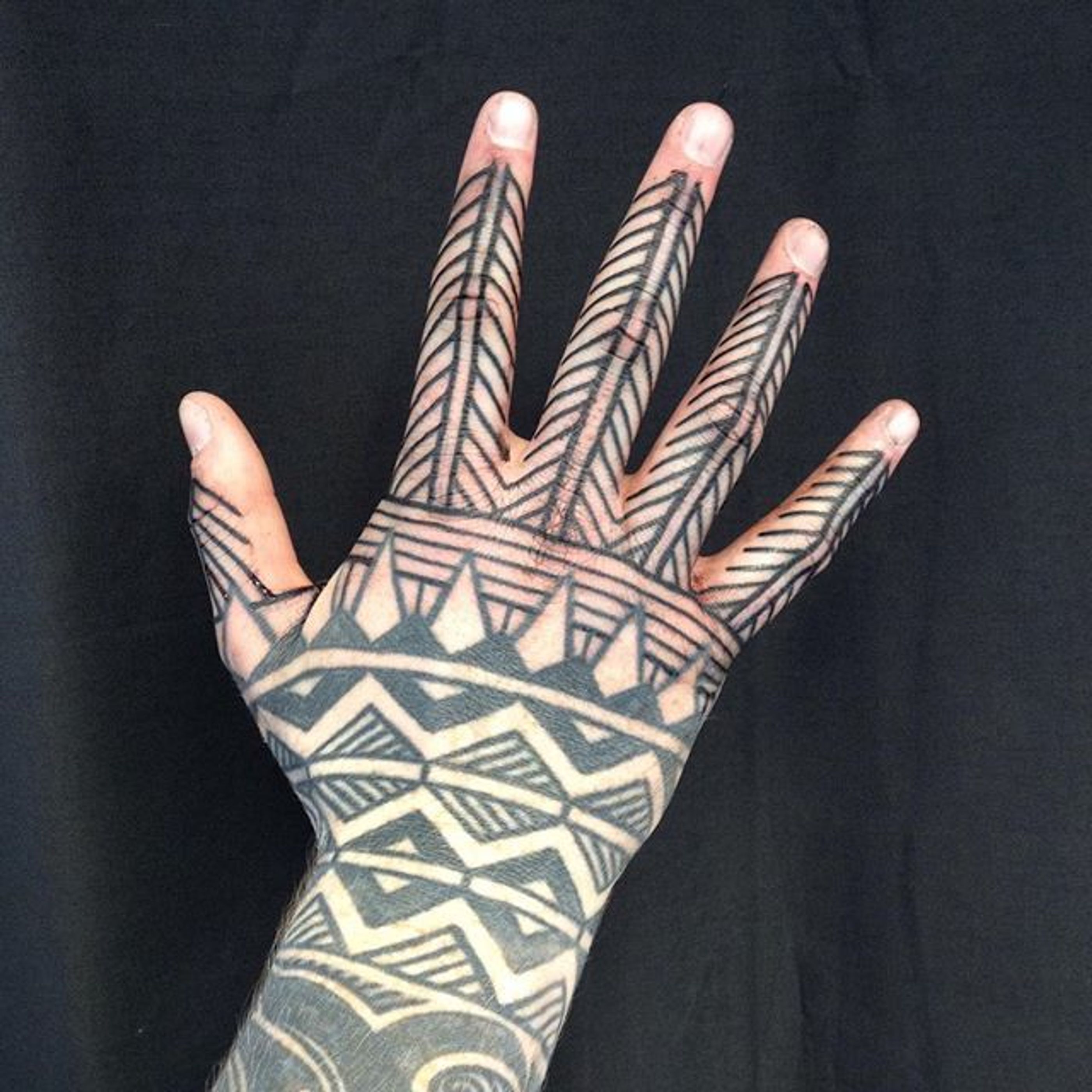 Blackwork Hand Tattoo by Curly Moore #blackwork #blackworkhand #blackworkhandtattoo #blackworktattoos #blackworkartists #hand #handtattoos #geometric linework #CurlyMoore