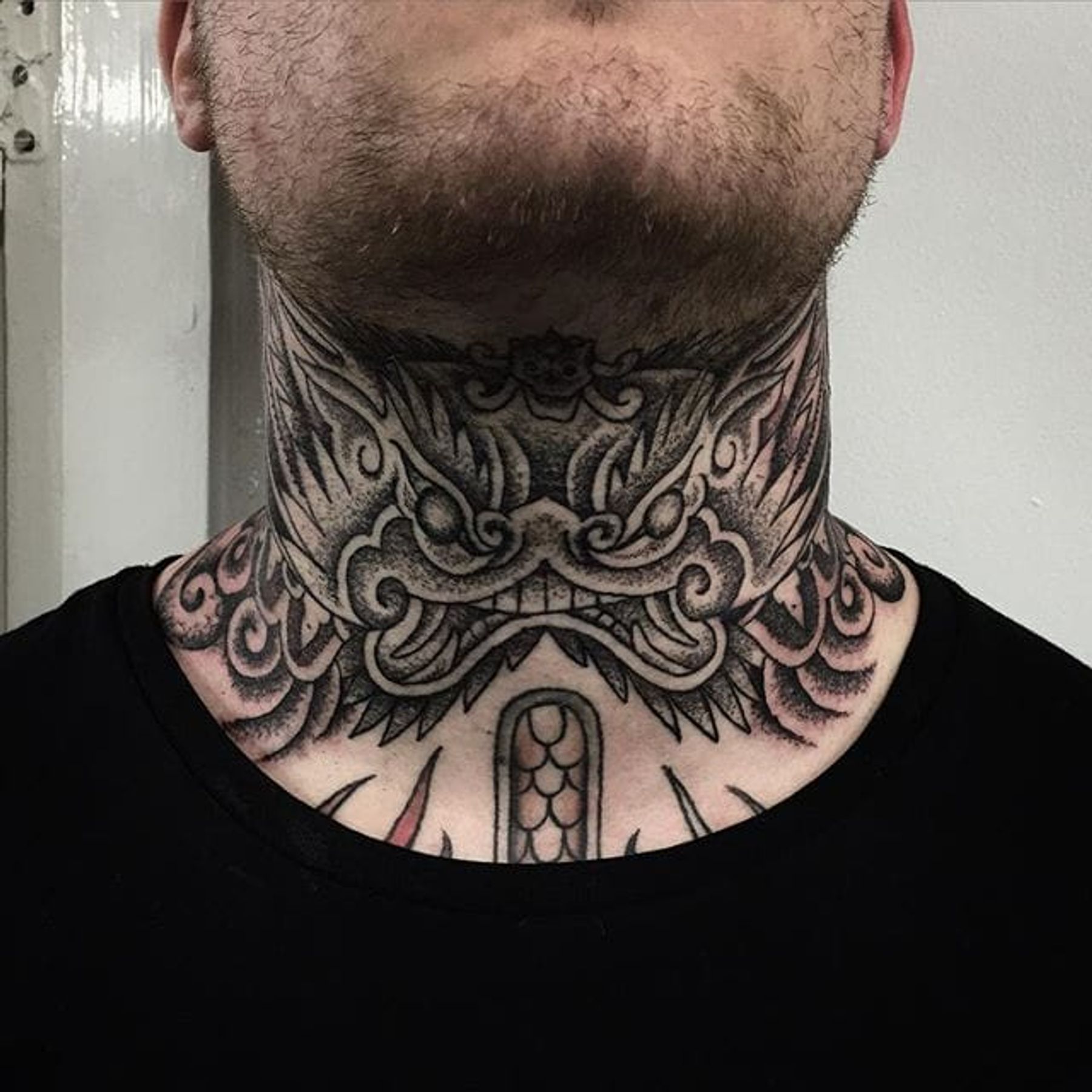 Incredible dot and linework on this throat. Tattoo by Aaron Breeze #AaronBreeze #neotraditional #traditional #LifeAndDeathTattoo #blackworker #dotwork #dragon