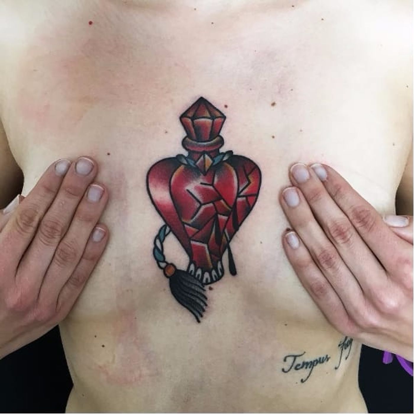 Perfume bottle tattoo by Paz Buñuel #PazBuñuel #traditional #perfumebottle #perfume #heart
