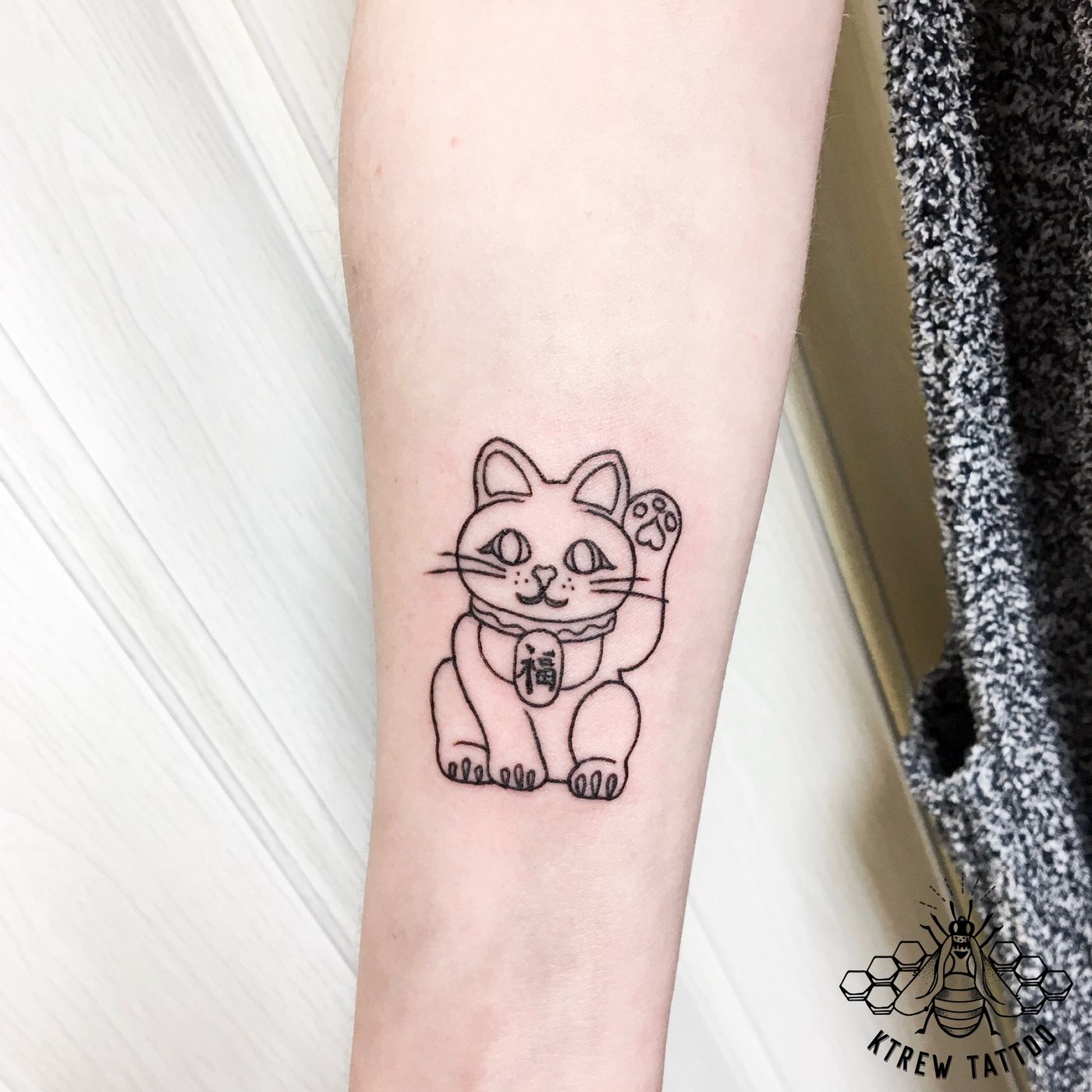 Lucky Cat Linework Tattoo by Kirstie Trew @ KTREW Tattoo • Birmingham UK 🇬🇧 #lineworktattoo #fineline #cat #cattattoo #cats #luckycattattoo #tattoo #birminghamuk
