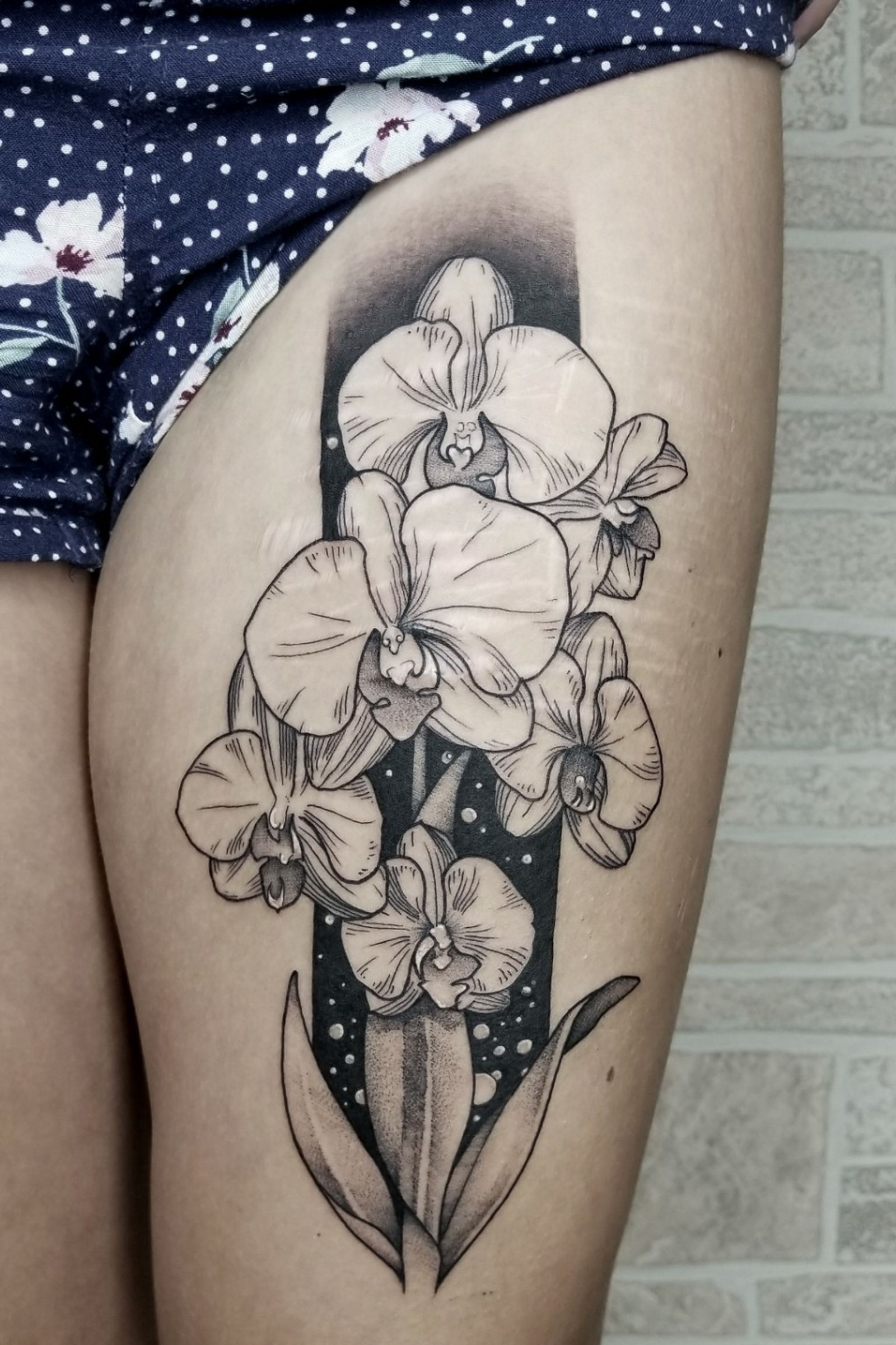 🌸🌸🌸 Scars blast-over on the thigh #blackwork #flowers #floral #chicago