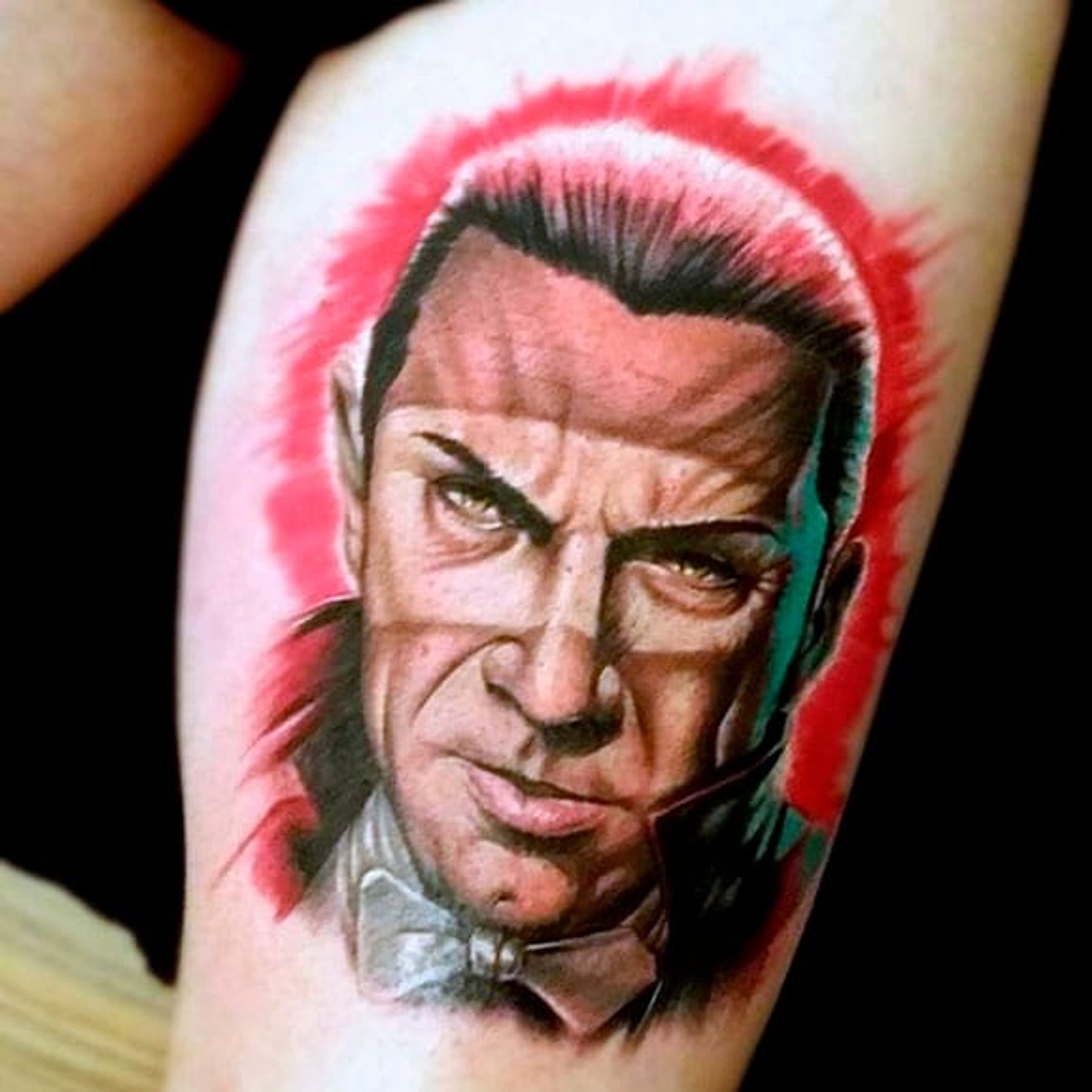 Stunning color version of a classic Bela scene Tattoo by Joaquin Ganga Lopez #Dracula #vampire #horror #cinema #BramStoker #colorwork #BelaLugosi #JoaquinGangaLopez #portrait