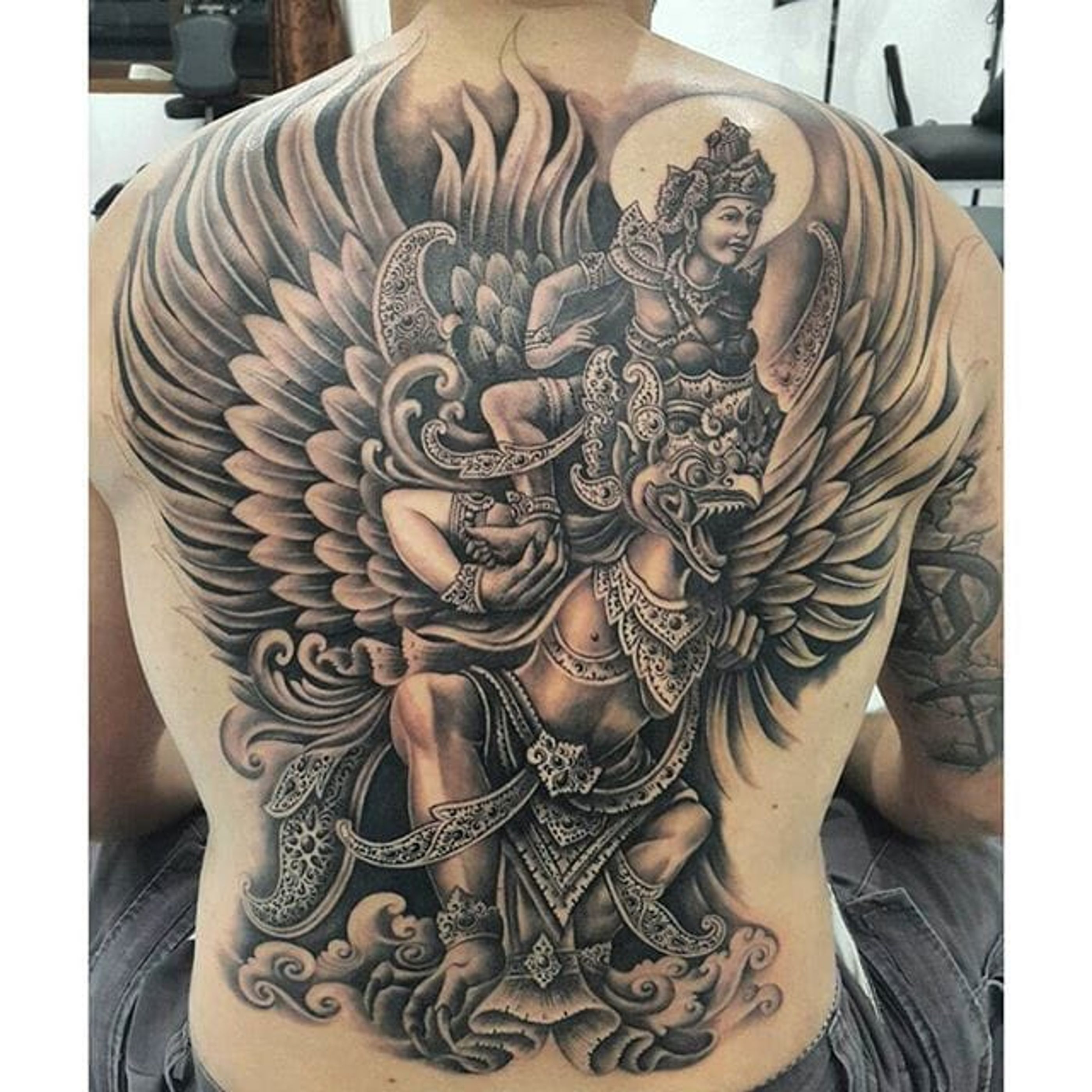 Black and grey Hindu back piece featuring a garuda, vishnu and jatayu by Pa'udy Bali. #blackandgrey #balinese #indonesian #Pa'udyBali #Hindu #garuda #vishnu #jatayu