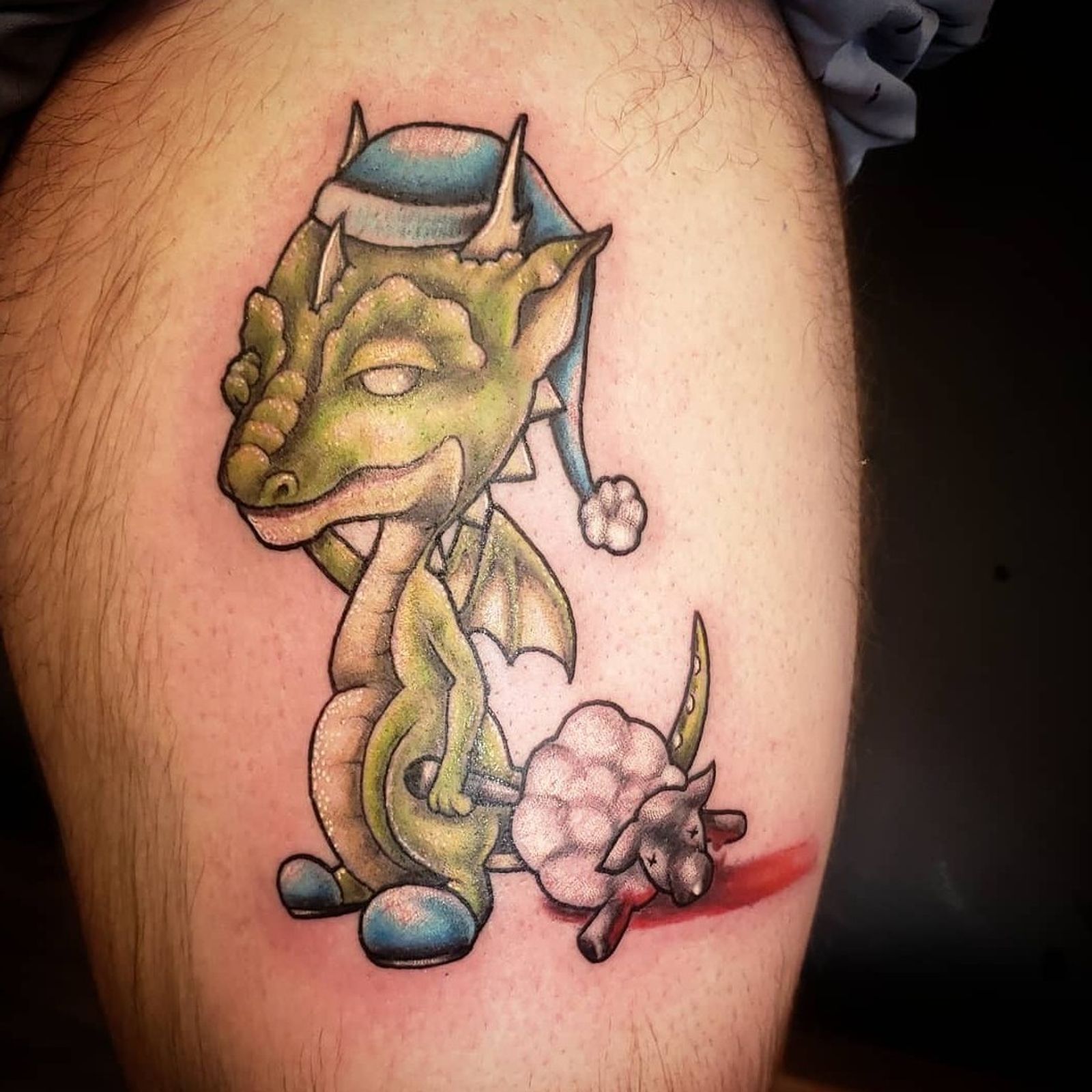 Original art by me as a tattoo! I love doing these #newschooltattoo #originalart #dragon #sleepydragon #dragontattoo #cute #sheep